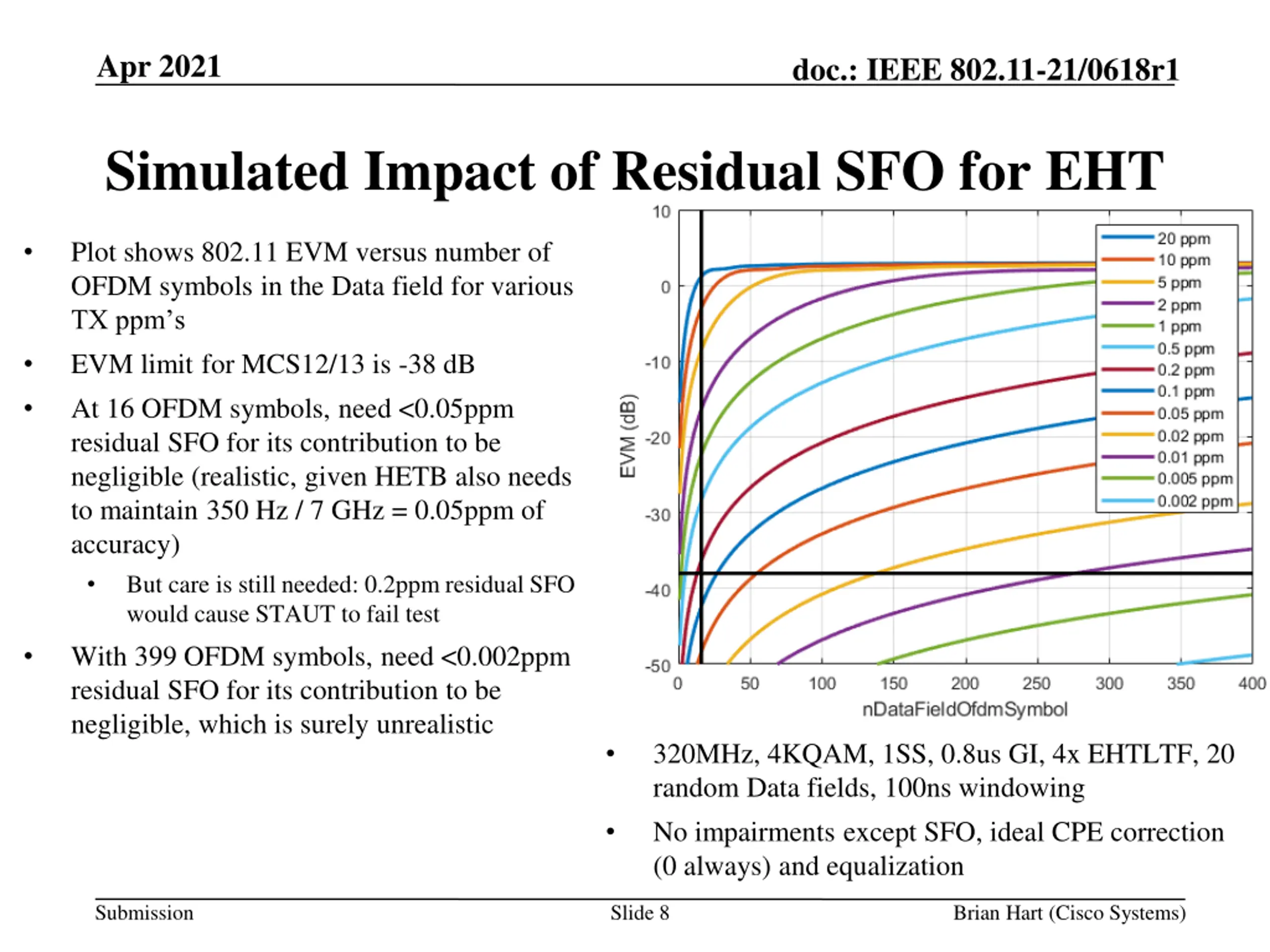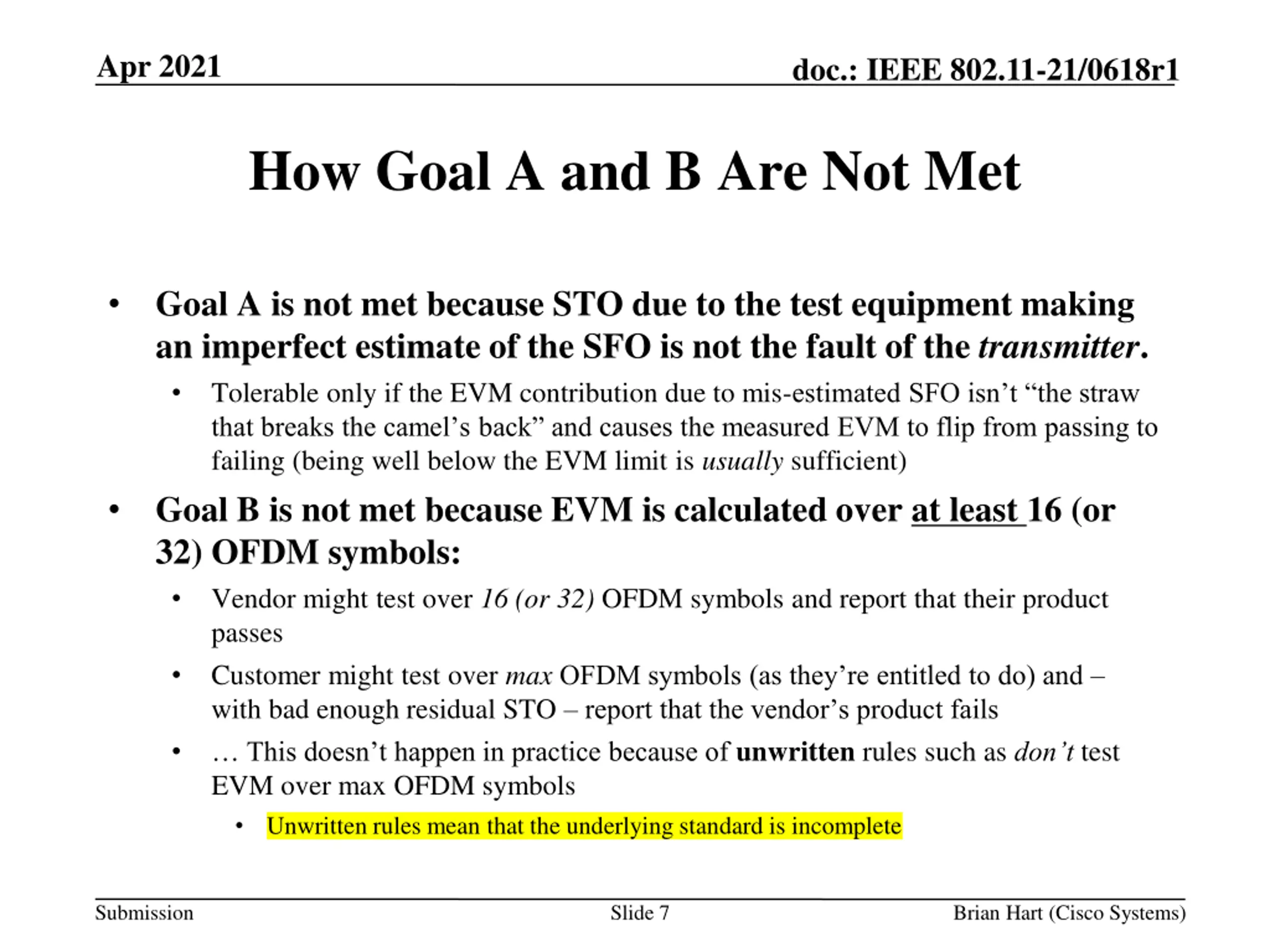 Apr 2021 doc.: IEEE 802.11-21/0618r1 How Goal A and B Are Not Met Goal A is not met because STO due to the test equipment making an imperfect estimate of the SFO is not the fault of the transmitter. Tolerable only if the EVM contribution due to mis-estimated SFO isn t the straw that breaks the camel s back and causes the measured EVM to flip from passing to failing (being well below the EVM limit is usually sufficient) Goal B is not met because EVM is calculated over at least 16 (or 32) OFDM symbols: Vendor might test over 16 (or 32) OFDM symbols and report that their product passes Customer might test over max OFDM symbols (as they re entitled to do) and with bad enough residual STO report that the vendor s product fails This doesn t happen in practice because of unwritten rules such as don t test EVM over max OFDM symbols Unwritten rules mean that the underlying standard is incomplete Submission Slide 7 Brian Hart (Cisco Systems)