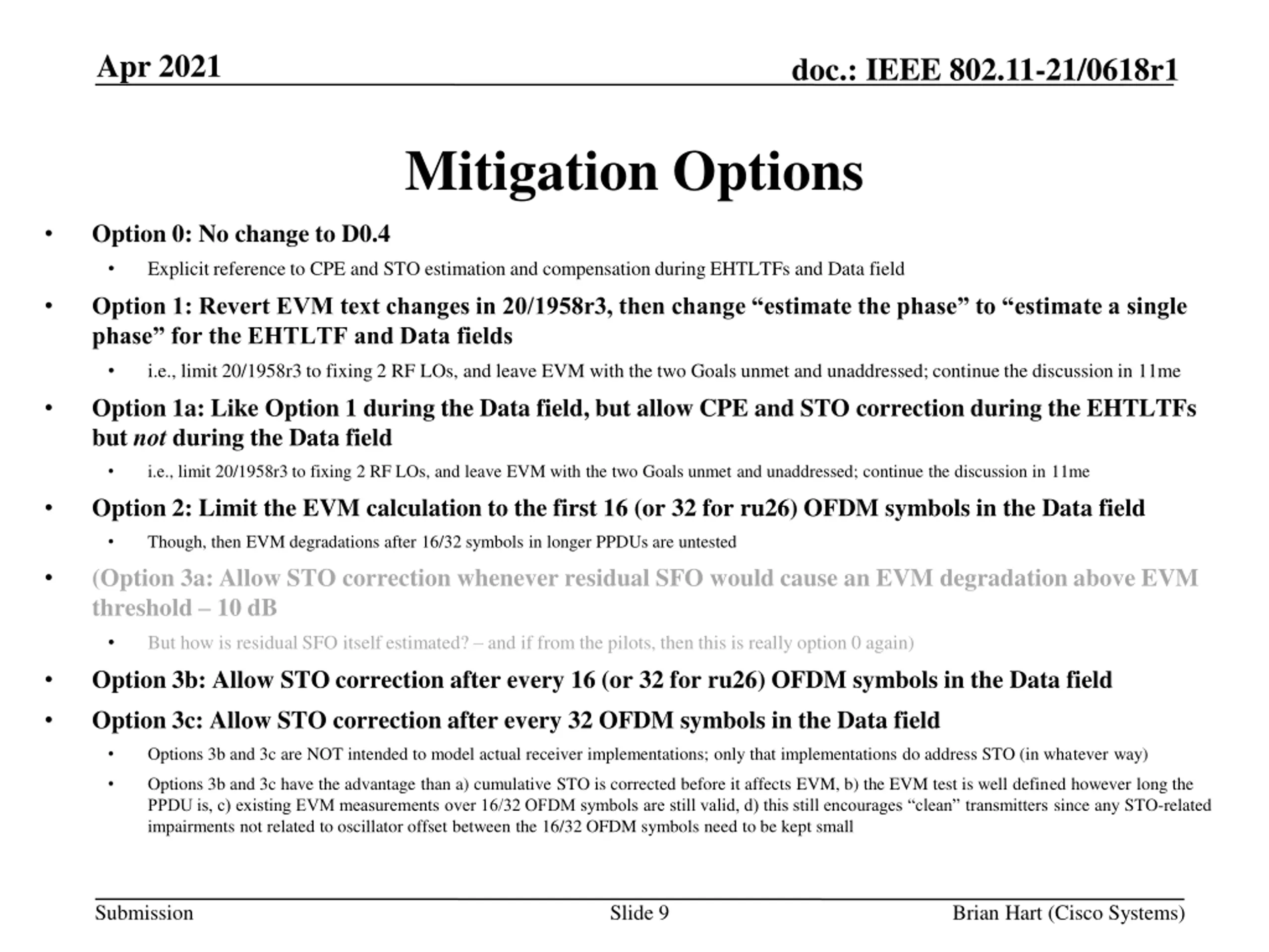 Apr 2021 doc.: IEEE 802.11-21/0618r1 Mitigation Options Option 0: No change to D0.4 Explicit reference to CPE and STO estimation and compensation during EHTLTFs and Data field Option 1: Revert EVM text changes in 20/1958r3, then change estimate the phase to estimate a single phase for the EHTLTF and Data fields i.e., limit 20/1958r3 to fixing 2 RF LOs, and leave EVM with the two Goals unmet and unaddressed; continue the discussion in 11me Option 1a: Like Option 1 during the Data field, but allow CPE and STO correction during the EHTLTFs but not during the Data field i.e., limit 20/1958r3 to fixing 2 RF LOs, and leave EVM with the two Goals unmet and unaddressed; continue the discussion in 11me Option 2: Limit the EVM calculation to the first 16 (or 32 for ru26) OFDM symbols in the Data field Though, then EVM degradations after 16/32 symbols in longer PPDUs are untested (Option 3a: Allow STO correction whenever residual SFO would cause an EVM degradation above EVM threshold 10 dB But how is residual SFO itself estimated? and if from the pilots, then this is really option 0 again) Option 3b: Allow STO correction after every 16 (or 32 for ru26) OFDM symbols in the Data field Option 3c: Allow STO correction after every 32 OFDM symbols in the Data field Options 3b and 3c are NOT intended to model actual receiver implementations; only that implementations do address STO (in whatever way) Options 3b and 3c have the advantage than a) cumulative STO is corrected before it affects EVM, b) the EVM test is well defined however long the PPDU is, c) existing EVM measurements over 16/32 OFDM symbols are still valid, d) this still encourages clean transmitters since any STO-related impairments not related to oscillator offset between the 16/32 OFDM symbols need to be kept small Submission Slide 9 Brian Hart (Cisco Systems)
