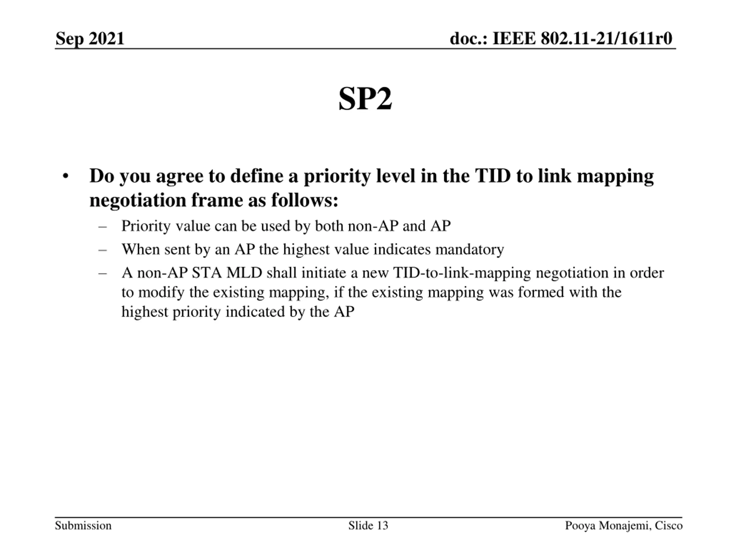 doc.: IEEE 802.11-21/1611r0 Sep 2021 SP2 Do you agree to define a priority level in the TID to link mapping negotiation frame as follows: Priority value can be used by both non-AP and AP When sent by an AP the highest value indicates mandatory A non-AP STA MLD shall initiate a new TID-to-link-mapping negotiation in order to modify the existing mapping, if the existing mapping was formed with the highest priority indicated by the AP Submission Slide 13 Pooya Monajemi, Cisco