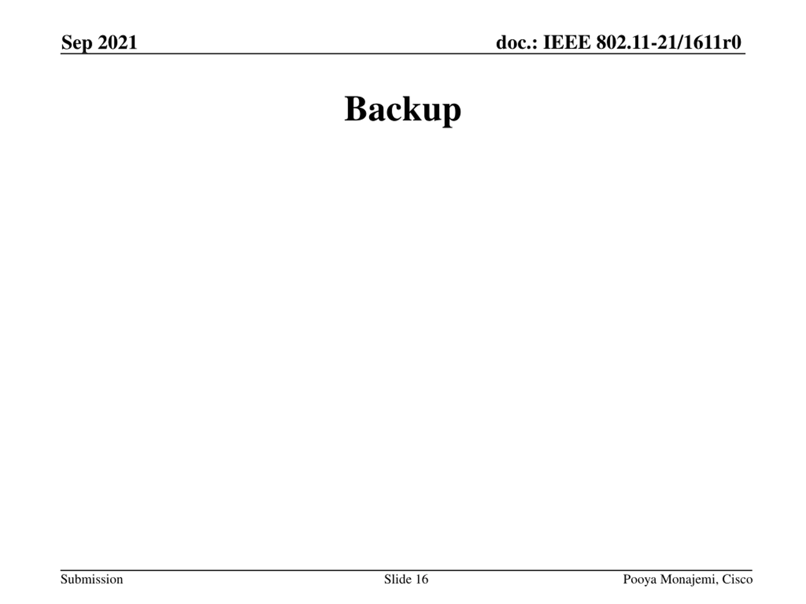 doc.: IEEE 802.11-21/1611r0 Sep 2021 Backup Submission Slide 16 Pooya Monajemi, Cisco