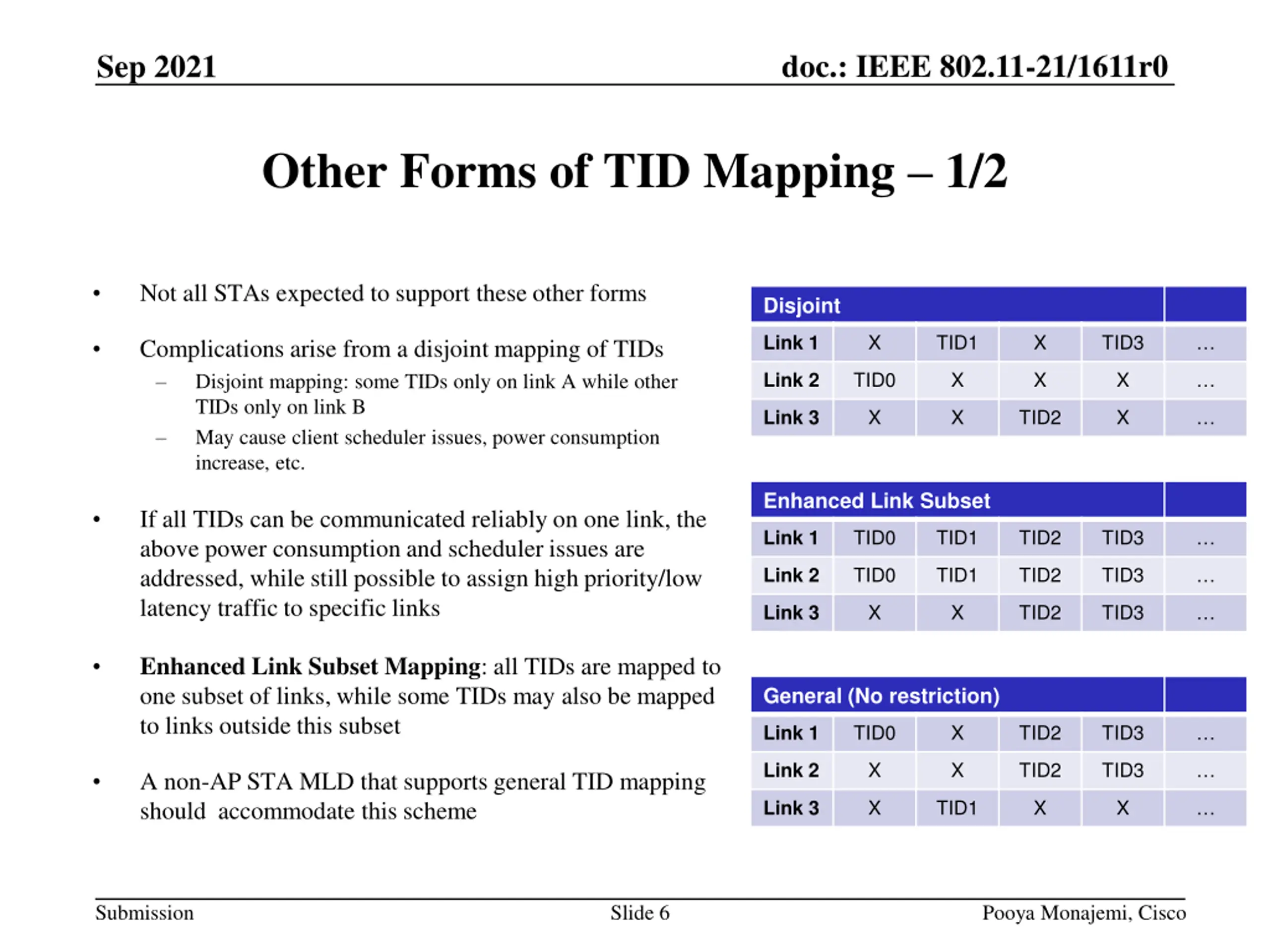 doc.: IEEE 802.11-21/1611r0 Sep 2021 All-TID-to-Link-Subset Mapping Mode of mapping equivalent to disabling a link or being associated to a subset of links Link Subset TID0 TID1 TID2 TID3 Link 1 TID0 TID1 TID2 TID3 Link 2 x x x x Link 3 STA implementations naturally support All-TID-to-Link-Subset mode Similar to existing dual/tri-band non-concurrent implementations Any conflicts (coex/etc) are temporary Link switch complications with avoiding duplicate groupcast data can be addressed through allowing enough time for STA to switch Proposal For Draft 2.0 : STA shall support all-TID-to-link-subset mapping TID-To-Link Mapping Negotiation Supported: Make value 0 reserved (currently no TID mapping support), support for value 2 (all-TIDs-to-link-subset) is mandatory, support for value 1 (general) is optional If indicated as mandatory by the AP, a non-AP STA shall accept an all-TID-to-link-subset mapping Submission Slide 5 Pooya Monajemi, Cisco