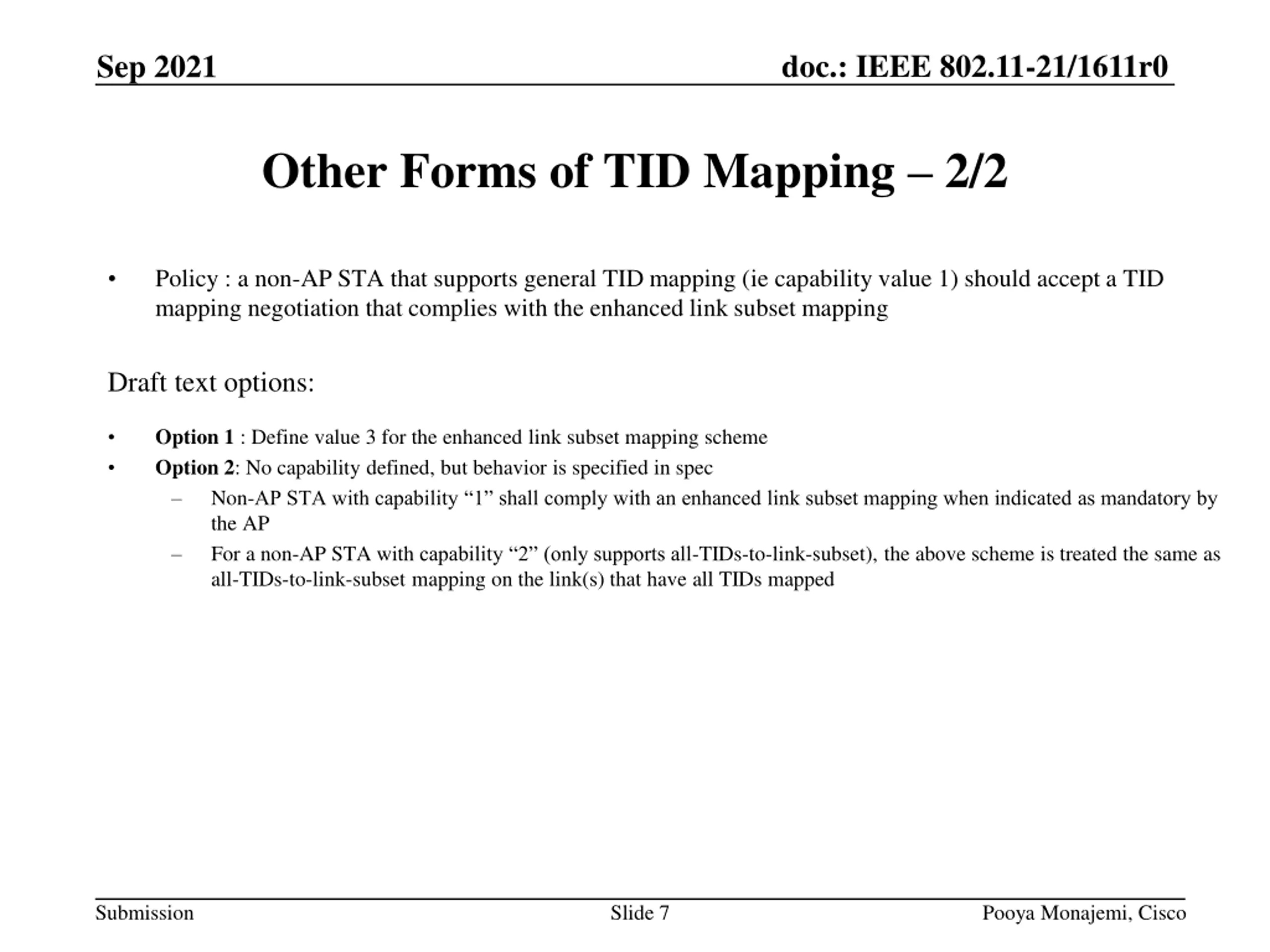 doc.: IEEE 802.11-21/1611r0 Sep 2021 Other Forms of TID Mapping 2/2 Policy : a non-AP STA that supports general TID mapping (ie capability value 1) should accept a TID mapping negotiation that complies with the enhanced link subset mapping Draft text options: Option 1 : Define value 3 for the enhanced link subset mapping scheme Option 2: No capability defined, but behavior is specified in spec Non-AP STA with capability 1 shall comply with an enhanced link subset mapping when indicated as mandatory by the AP For a non-AP STA with capability 2 (only supports all-TIDs-to-link-subset), the above scheme is treated the same as all-TIDs-to-link-subset mapping on the link(s) that have all TIDs mapped Submission Slide 7 Pooya Monajemi, Cisco