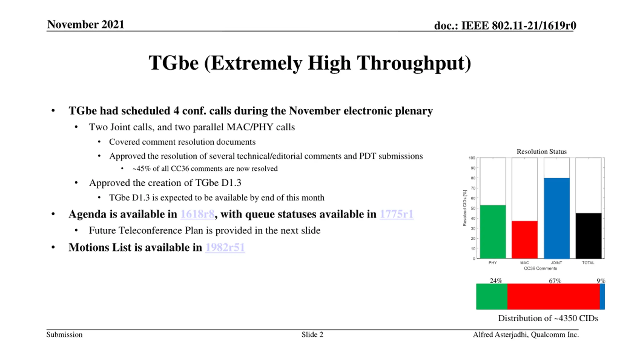 November 2021 doc.: IEEE 802.11-21/1619r0 TGbe (Extremely High Throughput) TGbe had scheduled 4 conf. calls during the November electronic plenary Two Joint calls, and two parallel MAC/PHY calls Covered comment resolution documents Approved the resolution of several technical/editorial comments and PDT submissions ~45% of all CC36 comments are now resolved Approved the creation of TGbe D1.3 TGbe D1.3 is expected to be available by end of this month Agenda is available in 1618r8, with queue statuses available in 1775r1 Future Teleconference Plan is provided in the next slide Motions List is available in 1982r51 Resolution Status 24% 67% 9% Distribution of ~4350 CIDs Submission Slide 2 Alfred Asterjadhi, Qualcomm Inc.