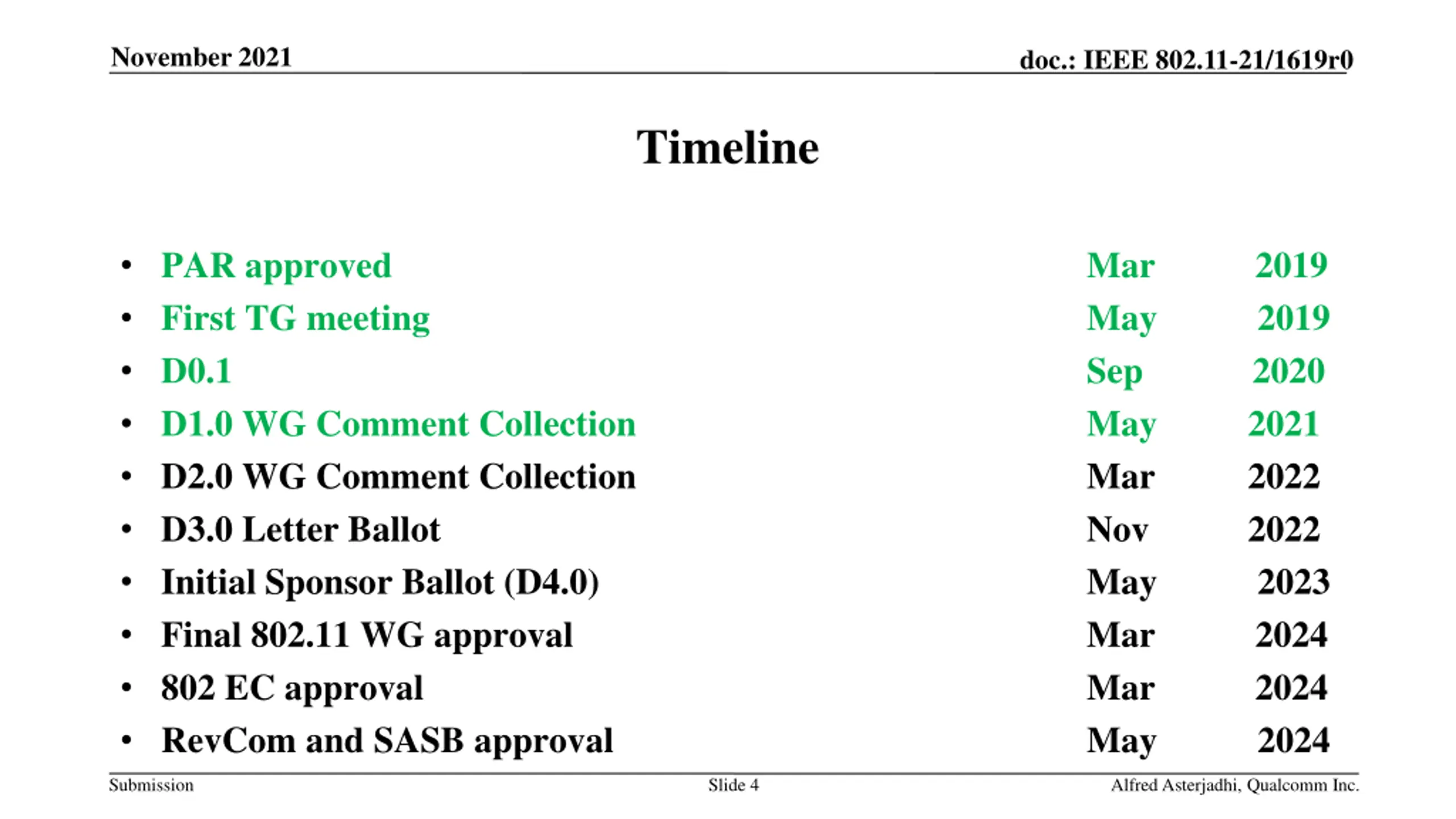 November 2021 doc.: IEEE 802.11-21/1619r0 Timeline PAR approved First TG meeting D0.1 D1.0 WG Comment Collection D2.0 WG Comment Collection D3.0 Letter Ballot Initial Sponsor Ballot (D4.0) Final 802.11 WG approval 802 EC approval RevCom and SASB approval Mar 2019 May 2019 Sep 2020 May Mar Nov May 2023 Mar 2024 Mar 2024 May 2024 2021 2022 2022 Submission Slide 4 Alfred Asterjadhi, Qualcomm Inc.