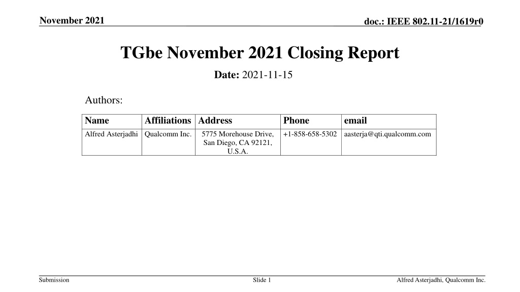 November 2021 doc.: IEEE 802.11-21/1619r0 TGbe November 2021 Closing Report Date: 2021-11-15 Authors: Name Alfred Asterjadhi Qualcomm Inc. Affiliations Address Phone +1-858-658-5302 aasterja@qti.qualcomm.com email 5775 Morehouse Drive, San Diego, CA 92121, U.S.A. Submission Slide 1 Alfred Asterjadhi, Qualcomm Inc.