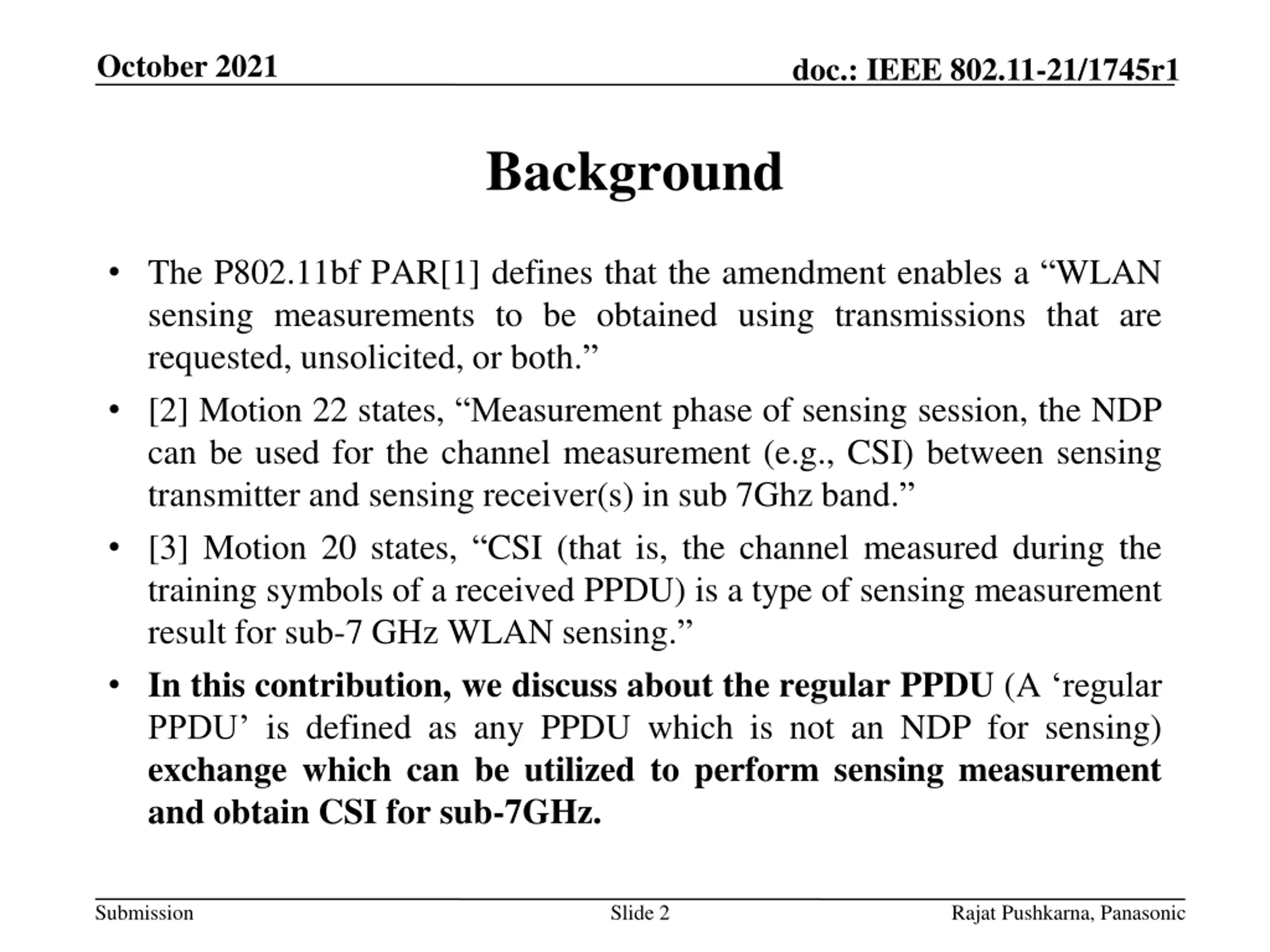 October 2021 doc.: IEEE 802.11-21/1745r1 Background The P802.11bf PAR[1] defines that the amendment enables a WLAN sensing measurements to be obtained using transmissions that are requested, unsolicited, or both. [2] Motion 22 states, Measurement phase of sensing session, the NDP can be used for the channel measurement (e.g., CSI) between sensing transmitter and sensing receiver(s) in sub 7Ghz band. [3] Motion 20 states, CSI (that is, the channel measured during the training symbols of a received PPDU) is a type of sensing measurement result for sub-7 GHz WLAN sensing. In this contribution, we discuss about the regular PPDU (A regular PPDU is defined as any PPDU which is not an NDP for sensing) exchange which can be utilized to perform sensing measurement and obtain CSI for sub-7GHz. Submission Slide 2 Rajat Pushkarna, Panasonic
