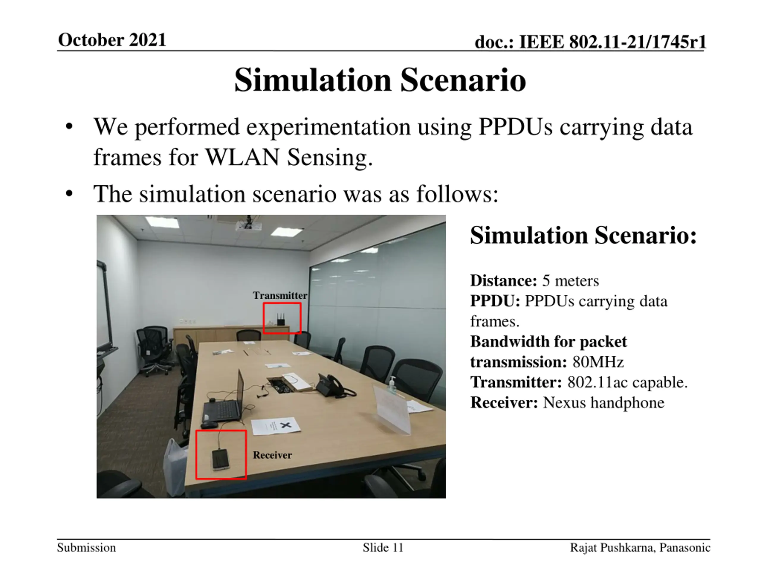 October 2021 doc.: IEEE 802.11-21/1745r1 Simulation Scenario We performed experimentation using PPDUs carrying data frames for WLAN Sensing. The simulation scenario was as follows: Simulation Scenario: Distance: 5 meters PPDU: PPDUs carrying data frames. Bandwidth for packet transmission: 80MHz Transmitter: 802.11ac capable. Receiver: Nexus handphone Transmitter Receiver Submission Slide 11 Rajat Pushkarna, Panasonic