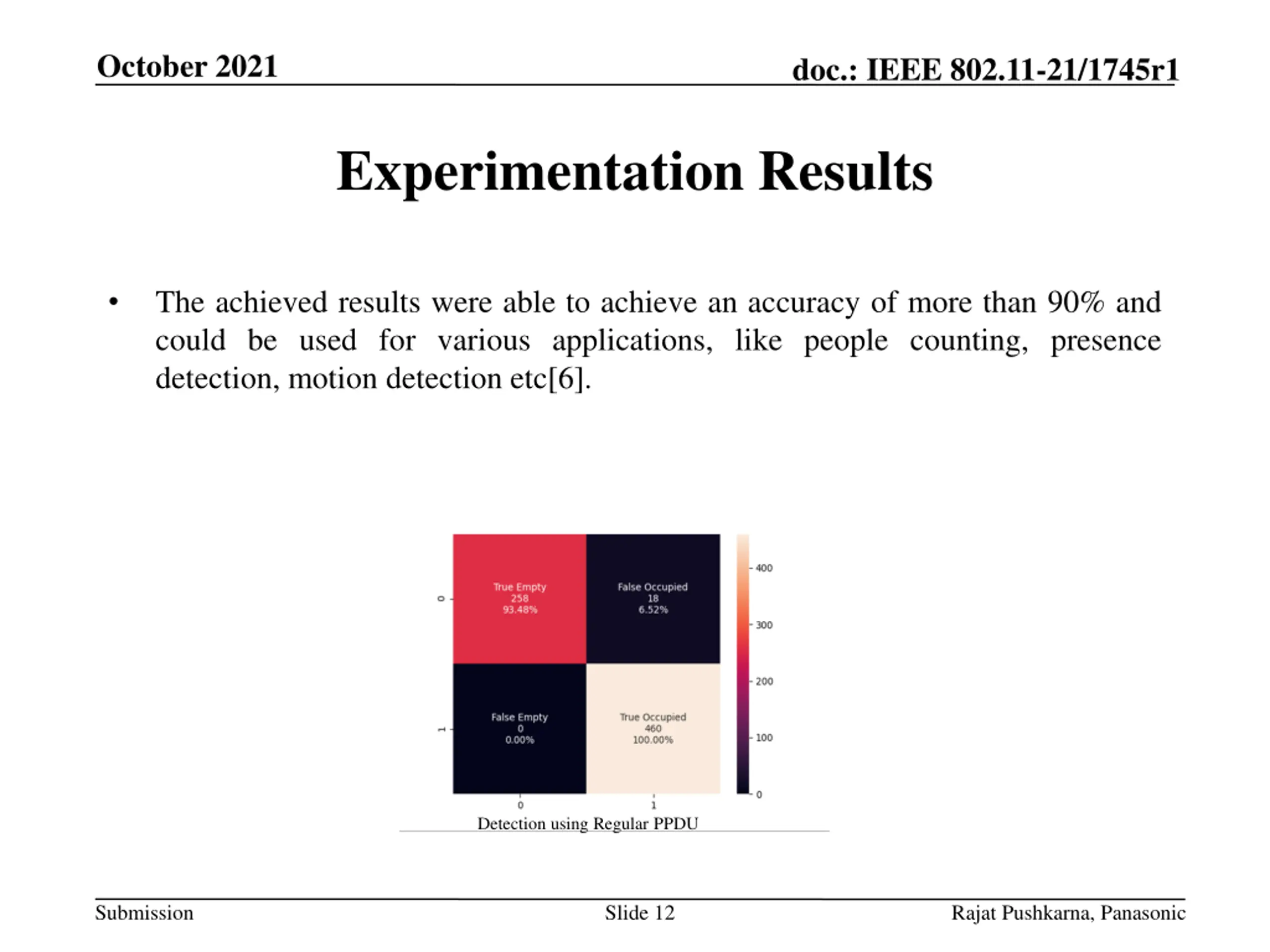 October 2021 doc.: IEEE 802.11-21/1745r1 Experimentation Results The achieved results were able to achieve an accuracy of more than 90% and could be used for various applications, like people counting, presence detection, motion detection etc[6]. Detection using Regular PPDU Submission Slide 12 Rajat Pushkarna, Panasonic