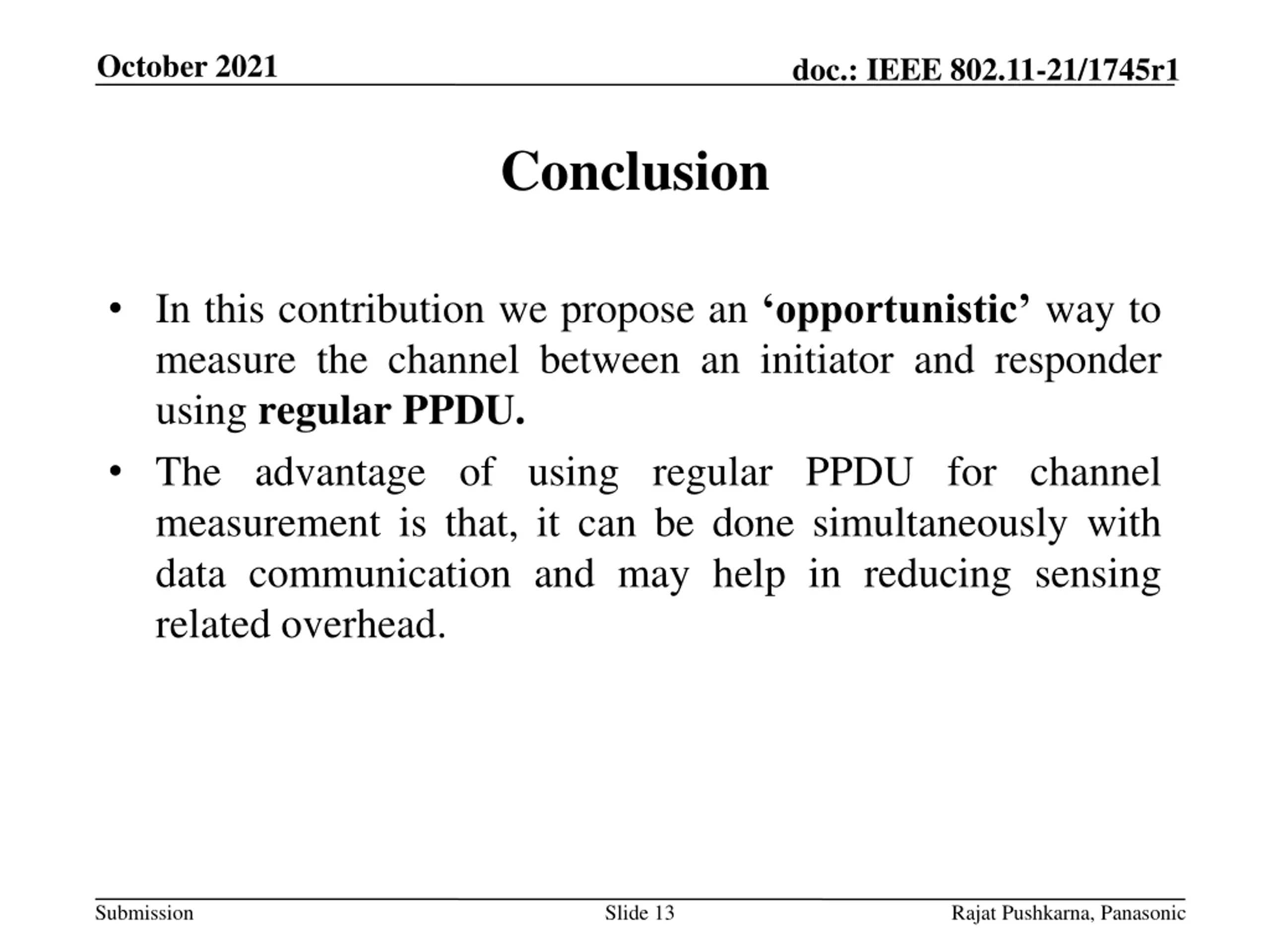 October 2021 doc.: IEEE 802.11-21/1745r1 Conclusion In this contribution we propose an opportunistic way to measure the channel between an initiator and responder using regular PPDU. The advantage of using regular PPDU for channel measurement is that, it can be done simultaneously with data communication and may help in reducing sensing related overhead. Submission Slide 13 Rajat Pushkarna, Panasonic