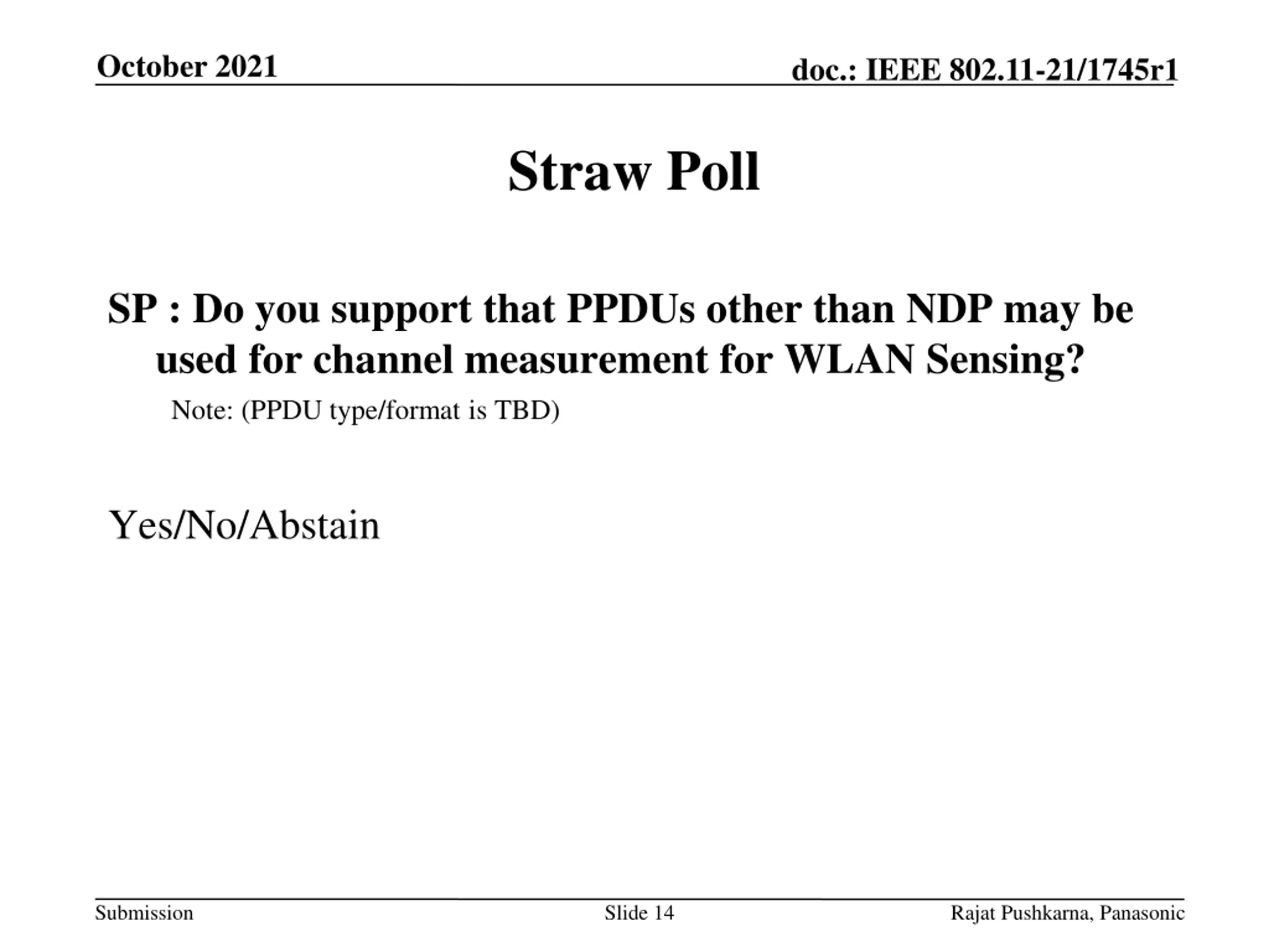 October 2021 doc.: IEEE 802.11-21/1745r1 Straw Poll SP : Do you support that PPDUs other than NDP may be used for channel measurement for WLAN Sensing? Note: (PPDU type/format is TBD) Yes/No/Abstain Submission Slide 14 Rajat Pushkarna, Panasonic