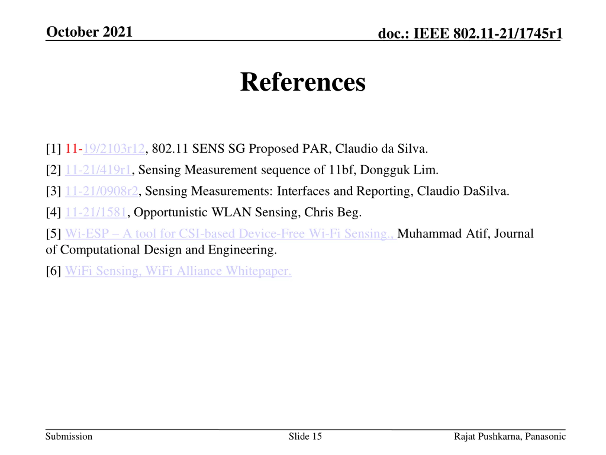 October 2021 doc.: IEEE 802.11-21/1745r1 References [1] 11-19/2103r12, 802.11 SENS SG Proposed PAR, Claudio da Silva. [2] 11-21/419r1, Sensing Measurement sequence of 11bf, Dongguk Lim. [3] 11-21/0908r2, Sensing Measurements: Interfaces and Reporting, Claudio DaSilva. [4] 11-21/1581, Opportunistic WLAN Sensing, Chris Beg. [5] Wi-ESP A tool for CSI-based Device-Free Wi-Fi Sensing., Muhammad Atif, Journal of Computational Design and Engineering. [6] WiFi Sensing, WiFi Alliance Whitepaper. Submission Slide 15 Rajat Pushkarna, Panasonic