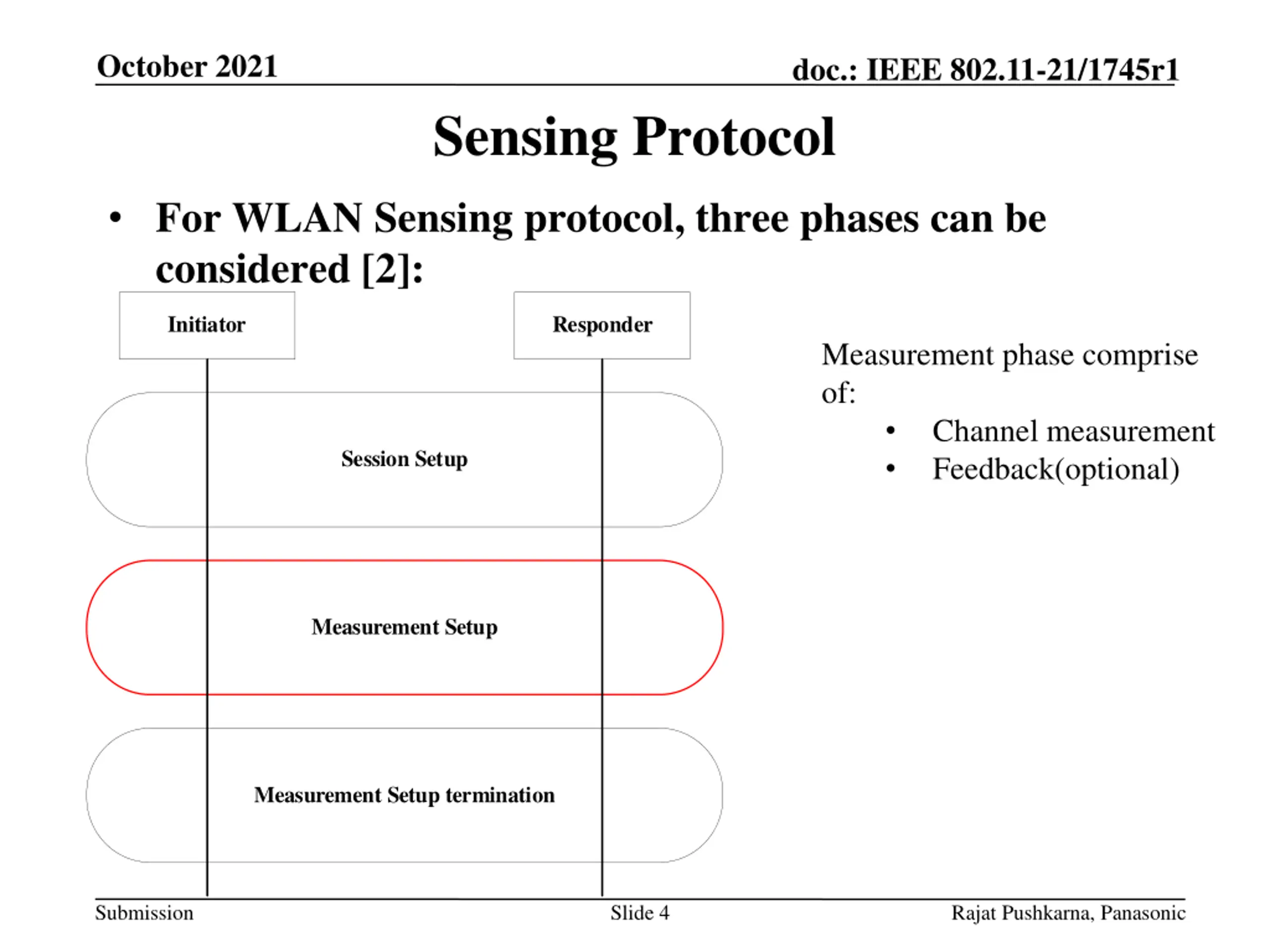 October 2021 doc.: IEEE 802.11-21/1745r1 Sensing Protocol For WLAN Sensing protocol, three phases can be considered [2]: Initiator Responder Measurement phase comprise of: Channel measurement Feedback(optional) Session Setup Measurement Setup Measurement Setup termination Submission Slide 4 Rajat Pushkarna, Panasonic