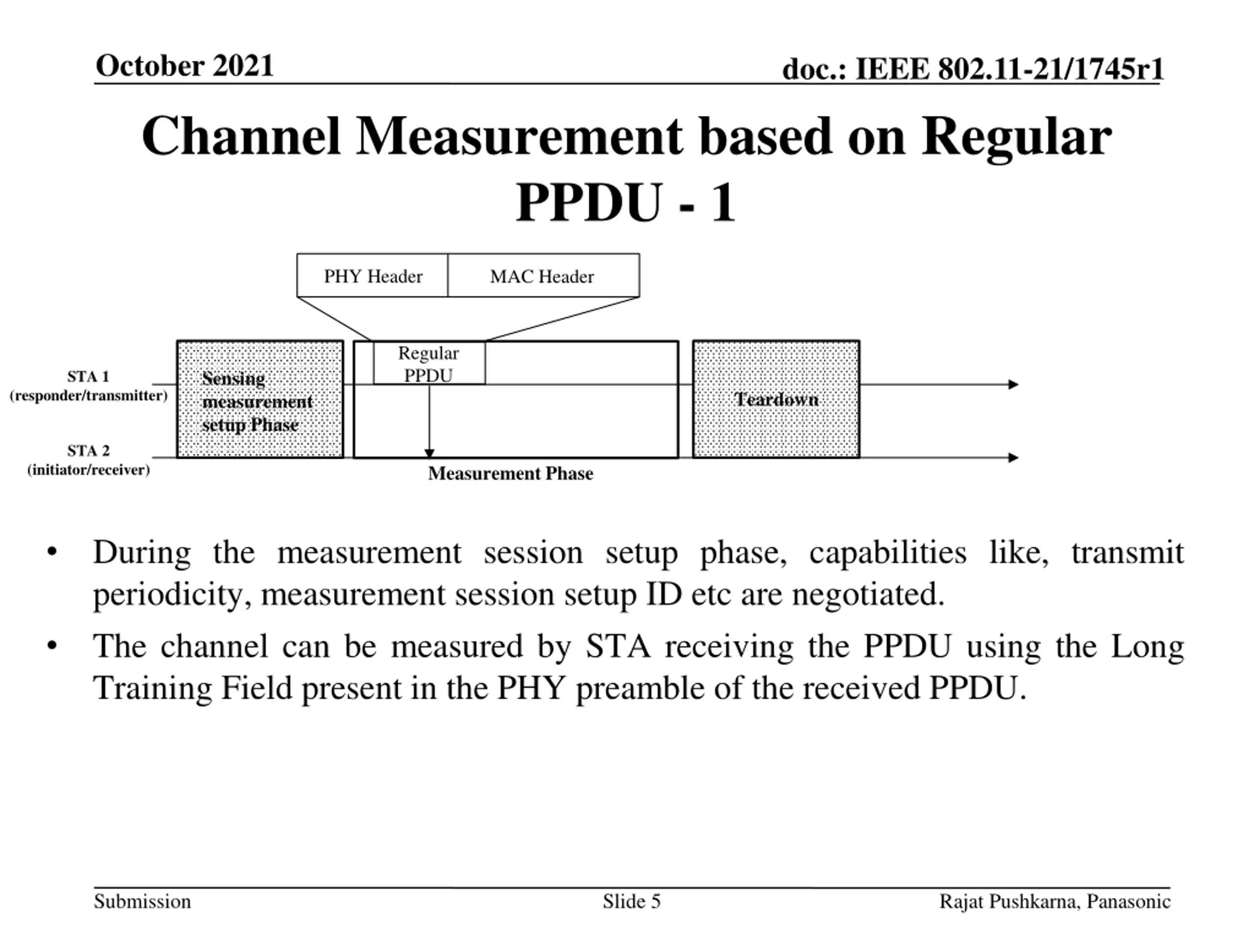 October 2021 doc.: IEEE 802.11-21/1745r1 Channel Measurement based on Regular PPDU - 1 PHY Header MAC Header Regular PPDU Regular PPDU Regular PPDU Sensing measurement setup Phase STA 1 (responder/transmitter) Teardown ACK ACK STA 2 (initiator/receiver) Measurement Phase During the measurement session setup phase, capabilities like, transmit periodicity, measurement session setup ID etc are negotiated. The channel can be measured by STA receiving the PPDU using the Long Training Field present in the PHY preamble of the received PPDU. Submission Slide 5 Rajat Pushkarna, Panasonic