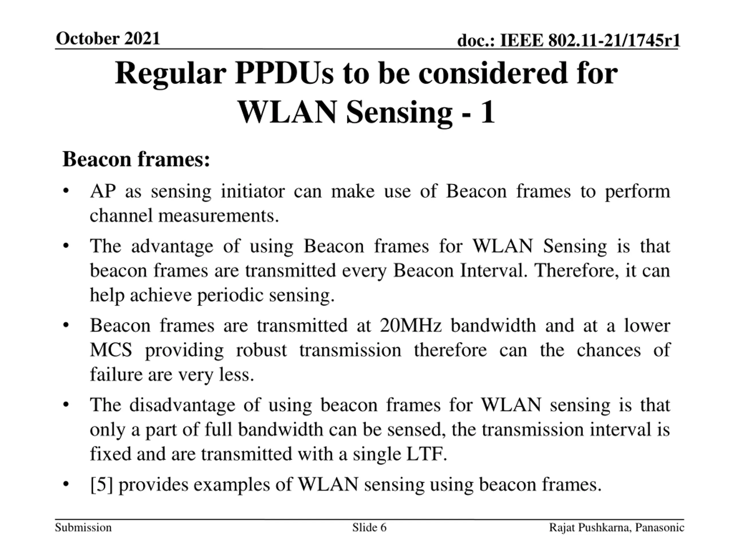 October 2021 doc.: IEEE 802.11-21/1745r1 Regular PPDUs to be considered for WLAN Sensing - 1 Beacon frames: AP as sensing initiator can make use of Beacon frames to perform channel measurements. The advantage of using Beacon frames for WLAN Sensing is that beacon frames are transmitted every Beacon Interval. Therefore, it can help achieve periodic sensing. Beacon frames are transmitted at 20MHz bandwidth and at a lower MCS providing robust transmission therefore can the chances of failure are very less. The disadvantage of using beacon frames for WLAN sensing is that only a part of full bandwidth can be sensed, the transmission interval is fixed and are transmitted with a single LTF. [5] provides examples of WLAN sensing using beacon frames. Submission Slide 6 Rajat Pushkarna, Panasonic