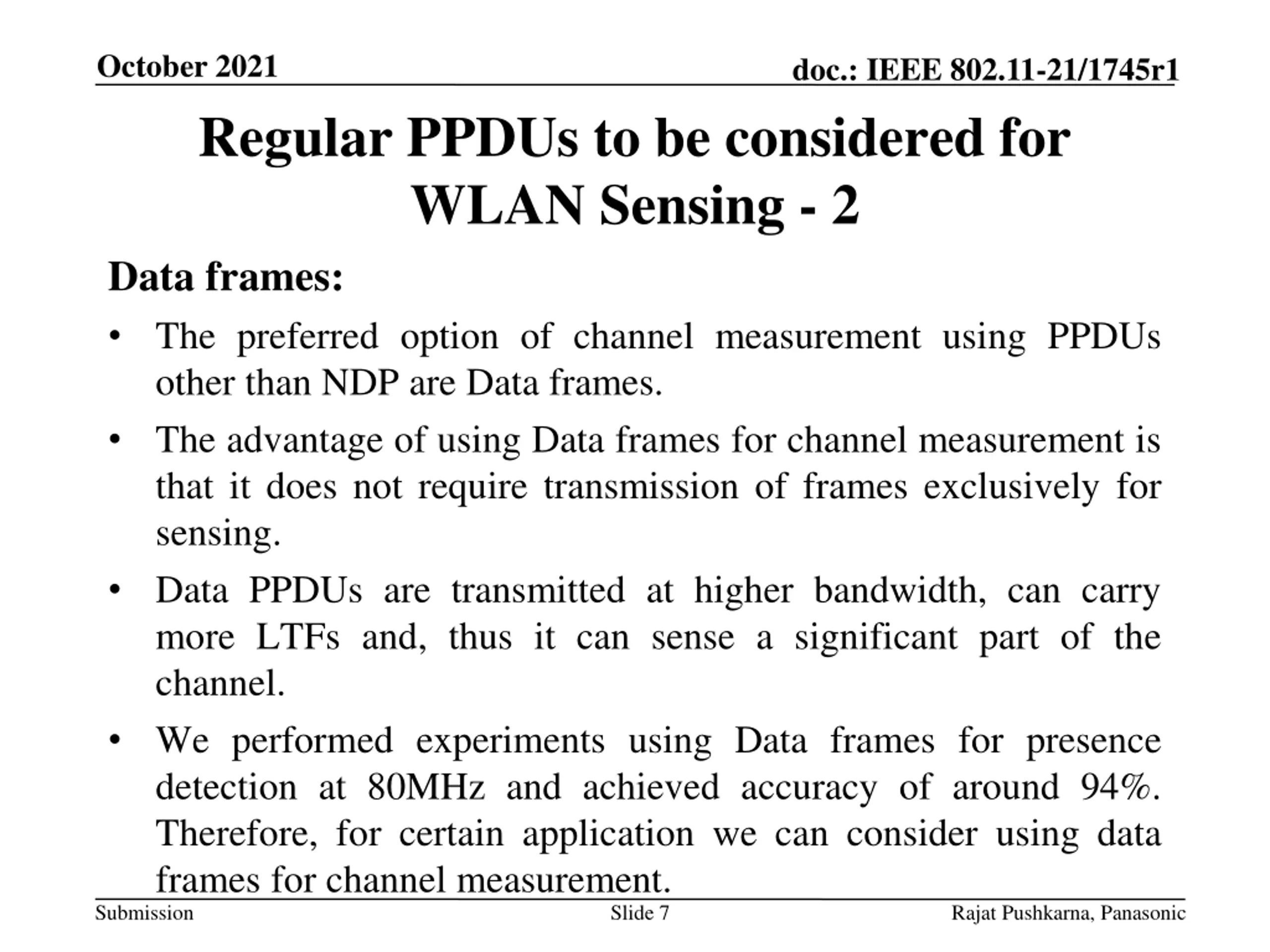 October 2021 doc.: IEEE 802.11-21/1745r1 Regular PPDUs to be considered for WLAN Sensing - 2 Data frames: The preferred option of channel measurement using PPDUs other than NDP are Data frames. The advantage of using Data frames for channel measurement is that it does not require transmission of frames exclusively for sensing. Data PPDUs are transmitted at higher bandwidth, can carry more LTFs and, thus it can sense a significant part of the channel. We performed experiments using Data frames for presence detection at 80MHz and achieved accuracy of around 94%. Therefore, for certain application we can consider using data frames for channel measurement. Slide 7 Submission Rajat Pushkarna, Panasonic