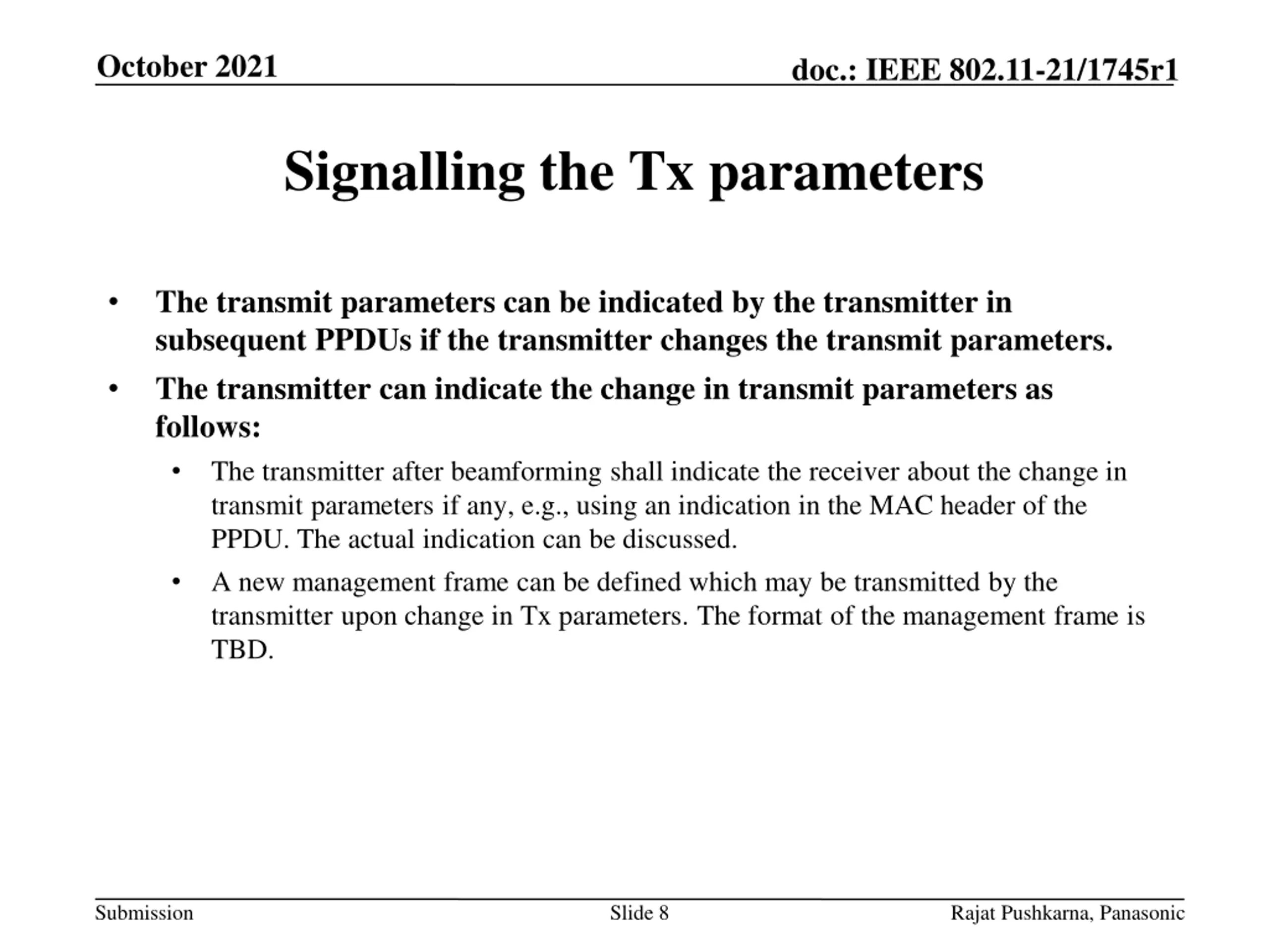 October 2021 doc.: IEEE 802.11-21/1745r1 Signalling the Tx parameters The transmit parameters can be indicated by the transmitter in subsequent PPDUs if the transmitter changes the transmit parameters. The transmitter can indicate the change in transmit parameters as follows: The transmitter after beamforming shall indicate the receiver about the change in transmit parameters if any, e.g., using an indication in the MAC header of the PPDU. The actual indication can be discussed. A new management frame can be defined which may be transmitted by the transmitter upon change in Tx parameters. The format of the management frame is TBD. Submission Slide 8 Rajat Pushkarna, Panasonic
