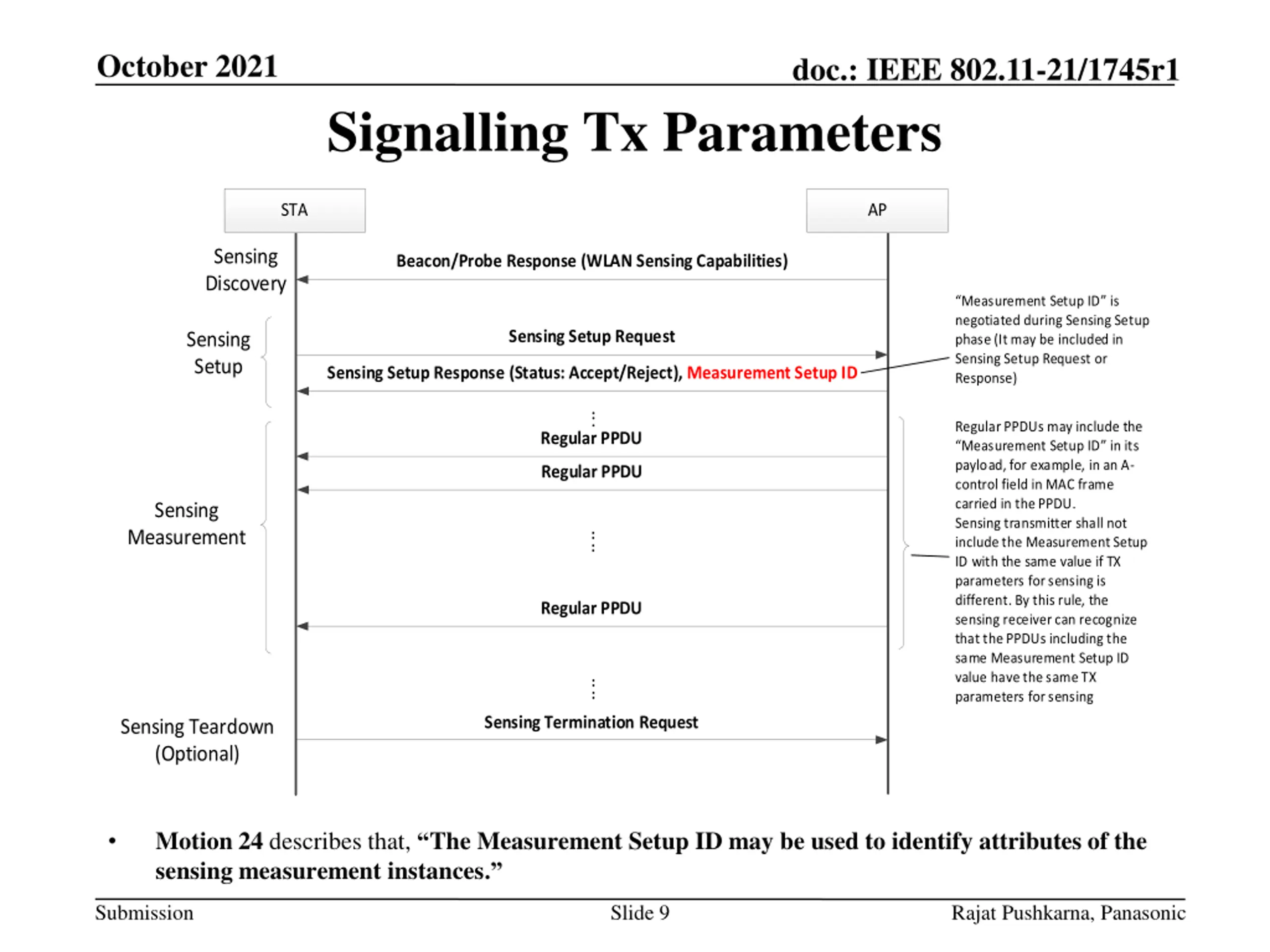 October 2021 doc.: IEEE 802.11-21/1745r1 Signalling Tx Parameters STA AP Sensing Discovery Beacon/Probe Response (WLAN Sensing Capabilities) Measurement Setup IDis negotiated during Sensing Setup phase (It may be included in Sensing Setup Request or Response) Sensing Setup Request Sensing Setup Sensing Setup Response (Status: Accept/Reject), Measurement Setup ID :: Regular PPDUs may include the Measurement Setup IDin its payload, for example, in an A- control field in MAC frame carried in the PPDU. Sensing transmitter shall not include the Measurement Setup ID with the same value if TX parameters for sensing is different. By this rule, the sensing receiver can recognize that the PPDUs including the same Measurement Setup ID value have the same TX parameters for sensing Regular PPDU Regular PPDU Sensing Measurement :: :: Sensing Termination Request Sensing Teardown (Optional) Motion 24 describes that, The Measurement Setup ID may be used to identify attributes of the sensing measurement instances. Submission Slide 9 Rajat Pushkarna, Panasonic