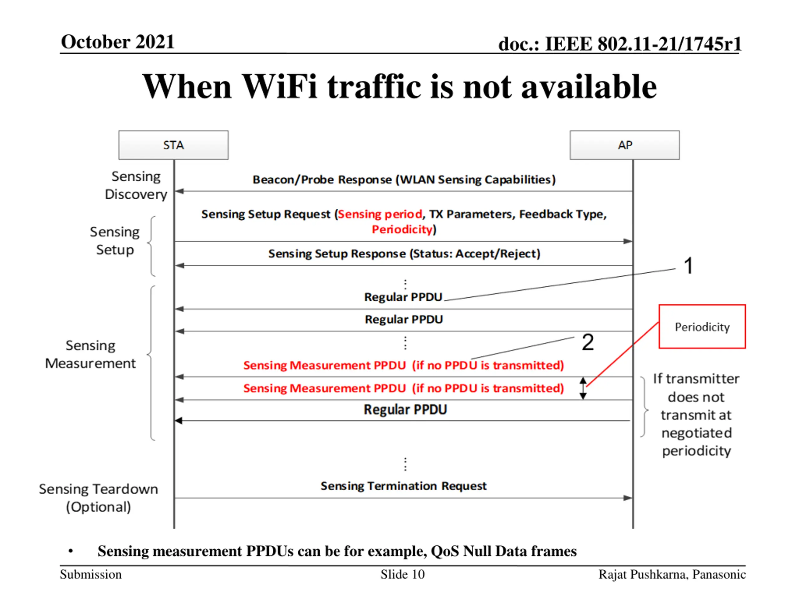 October 2021 doc.: IEEE 802.11-21/1745r1 When WiFi traffic is not available Sensing measurement PPDUs can be for example, QoS Null Data frames Submission Slide 10 Rajat Pushkarna, Panasonic