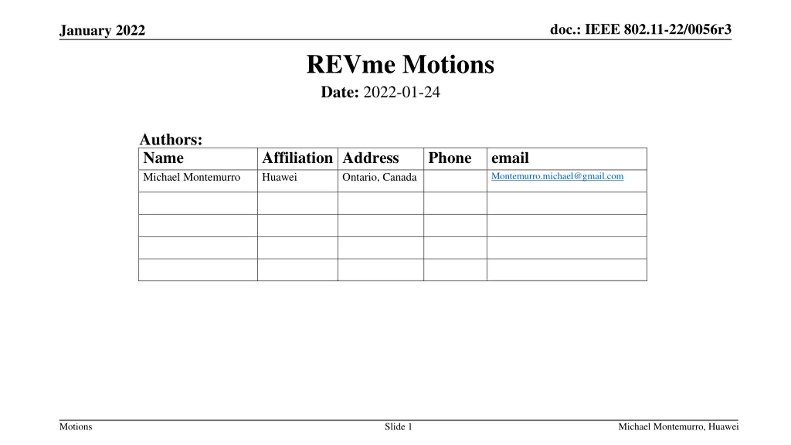 doc.: IEEE 802.11-22/0056r3 January 2022 REVme Motions Date: 2022-01-24 Authors: Name Michael Montemurro Affiliation Address Huawei Phone email Montemurro.michael@gmail.com Ontario, Canada Motions Slide 1 Michael Montemurro, Huawei