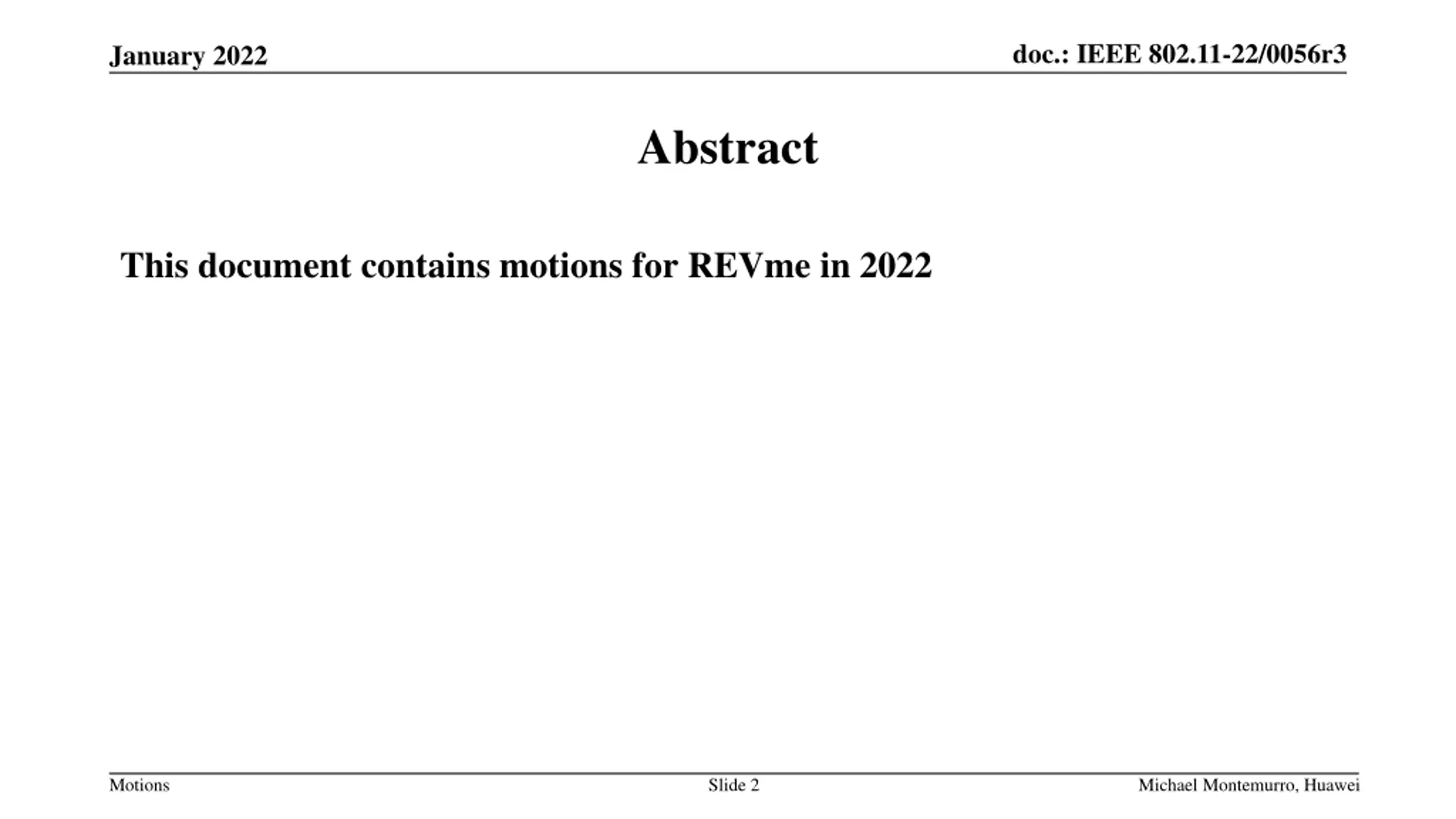 doc.: IEEE 802.11-22/0056r3 January 2022 Abstract This document contains motions for REVme in 2022 Motions Slide 2 Michael Montemurro, Huawei