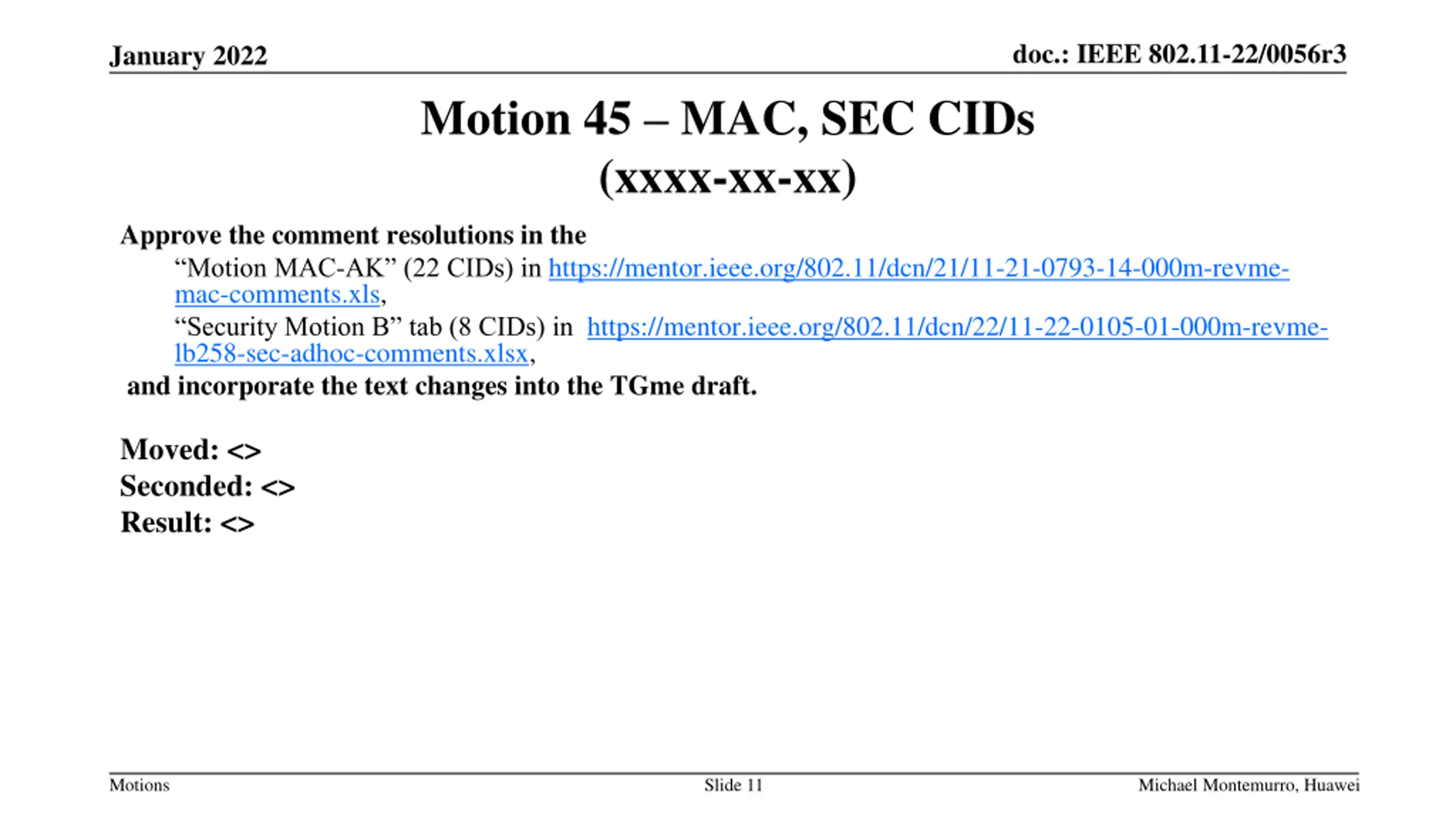 doc.: IEEE 802.11-22/0056r3 January 2022 Motion 45 MAC, SEC CIDs (xxxx-xx-xx) Approve the comment resolutions in the Motion MAC-AK (22 CIDs) in https://mentor.ieee.org/802.11/dcn/21/11-21-0793-14-000m-revme- mac-comments.xls, Security Motion B tab (8 CIDs) in https://mentor.ieee.org/802.11/dcn/22/11-22-0105-01-000m-revme- lb258-sec-adhoc-comments.xlsx, and incorporate the text changes into the TGme draft. Moved: <> Seconded: <> Result: <> Motions Slide 11 Michael Montemurro, Huawei