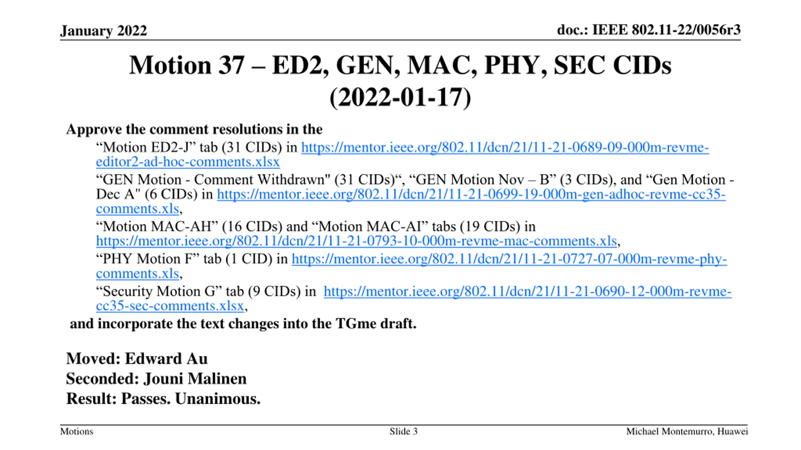 doc.: IEEE 802.11-22/0056r3 January 2022 Motion 37 ED2, GEN, MAC, PHY, SEC CIDs (2022-01-17) Approve the comment resolutions in the Motion ED2-J tab (31 CIDs) in https://mentor.ieee.org/802.11/dcn/21/11-21-0689-09-000m-revme- editor2-ad-hoc-comments.xlsx GEN Motion - Comment Withdrawn" (31 CIDs) , GEN Motion Nov B (3 CIDs), and Gen Motion - Dec A" (6 CIDs) in https://mentor.ieee.org/802.11/dcn/21/11-21-0699-19-000m-gen-adhoc-revme-cc35- comments.xls, Motion MAC-AH (16 CIDs) and Motion MAC-AI tabs (19 CIDs) in https://mentor.ieee.org/802.11/dcn/21/11-21-0793-10-000m-revme-mac-comments.xls, PHY Motion F tab (1 CID) in https://mentor.ieee.org/802.11/dcn/21/11-21-0727-07-000m-revme-phy- comments.xls, Security Motion G tab (9 CIDs) in https://mentor.ieee.org/802.11/dcn/21/11-21-0690-12-000m-revme- cc35-sec-comments.xlsx, and incorporate the text changes into the TGme draft. Moved: Edward Au Seconded: Jouni Malinen Result: Passes. Unanimous. Motions Slide 3 Michael Montemurro, Huawei