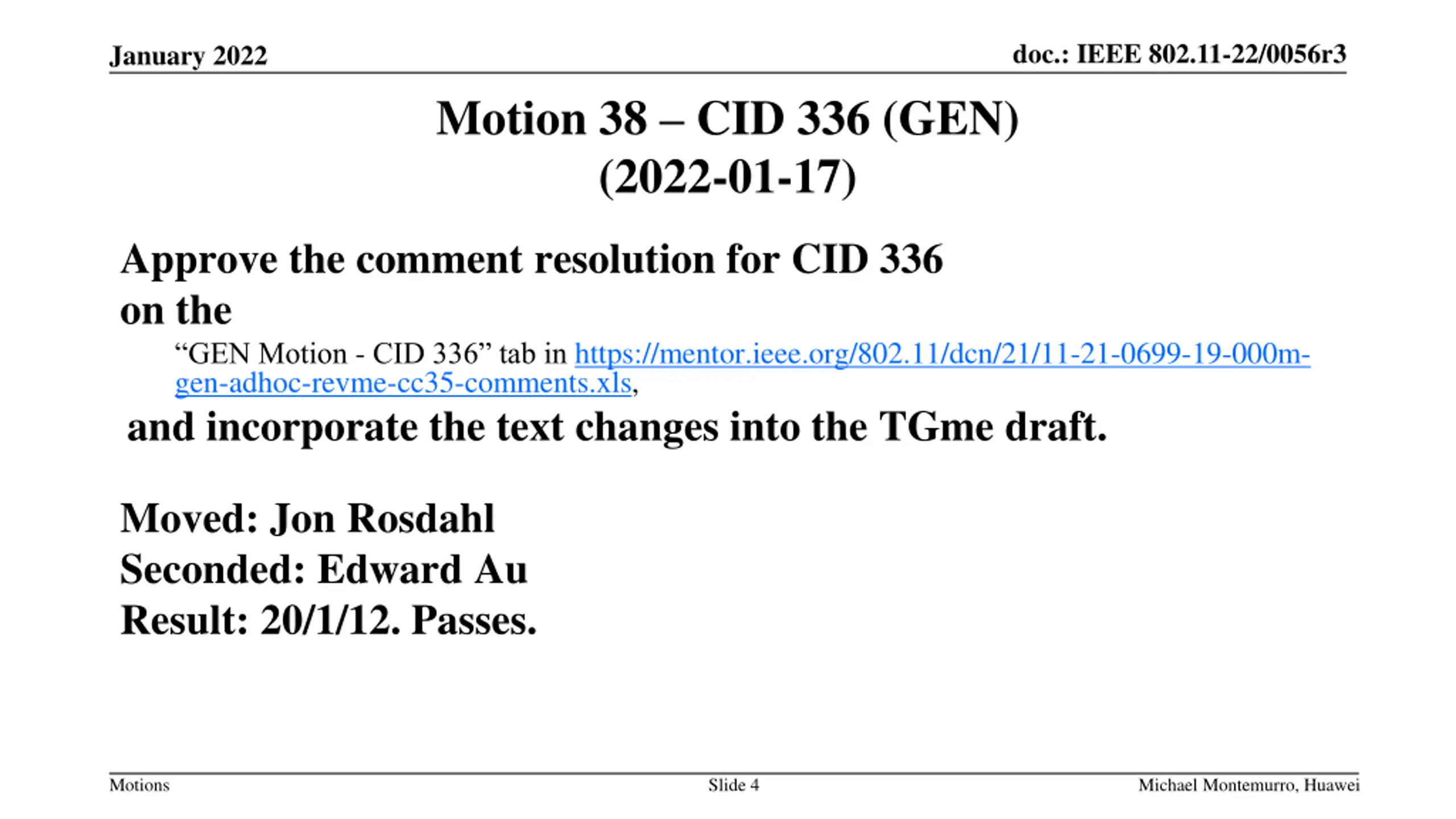 doc.: IEEE 802.11-22/0056r3 January 2022 Motion 38 CID 336 (GEN) (2022-01-17) Approve the comment resolution for CID 336 on the GEN Motion - CID 336 tab in https://mentor.ieee.org/802.11/dcn/21/11-21-0699-19-000m- gen-adhoc-revme-cc35-comments.xls, and incorporate the text changes into the TGme draft. Moved: Jon Rosdahl Seconded: Edward Au Result: 20/1/12. Passes. Motions Slide 4 Michael Montemurro, Huawei