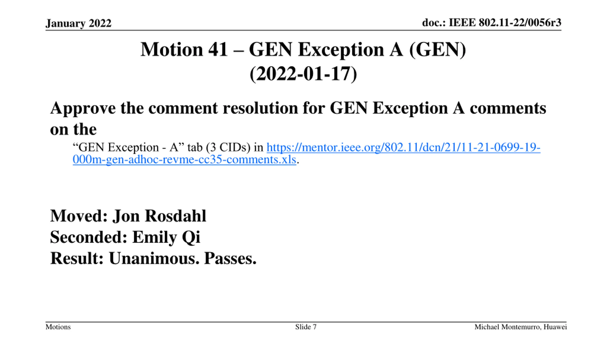 doc.: IEEE 802.11-22/0056r3 January 2022 Motion 41 GEN Exception A (GEN) (2022-01-17) Approve the comment resolution for GEN Exception A comments on the GEN Exception - A tab (3 CIDs) in https://mentor.ieee.org/802.11/dcn/21/11-21-0699-19- 000m-gen-adhoc-revme-cc35-comments.xls. Moved: Jon Rosdahl Seconded: Emily Qi Result: Unanimous. Passes. Motions Slide 7 Michael Montemurro, Huawei