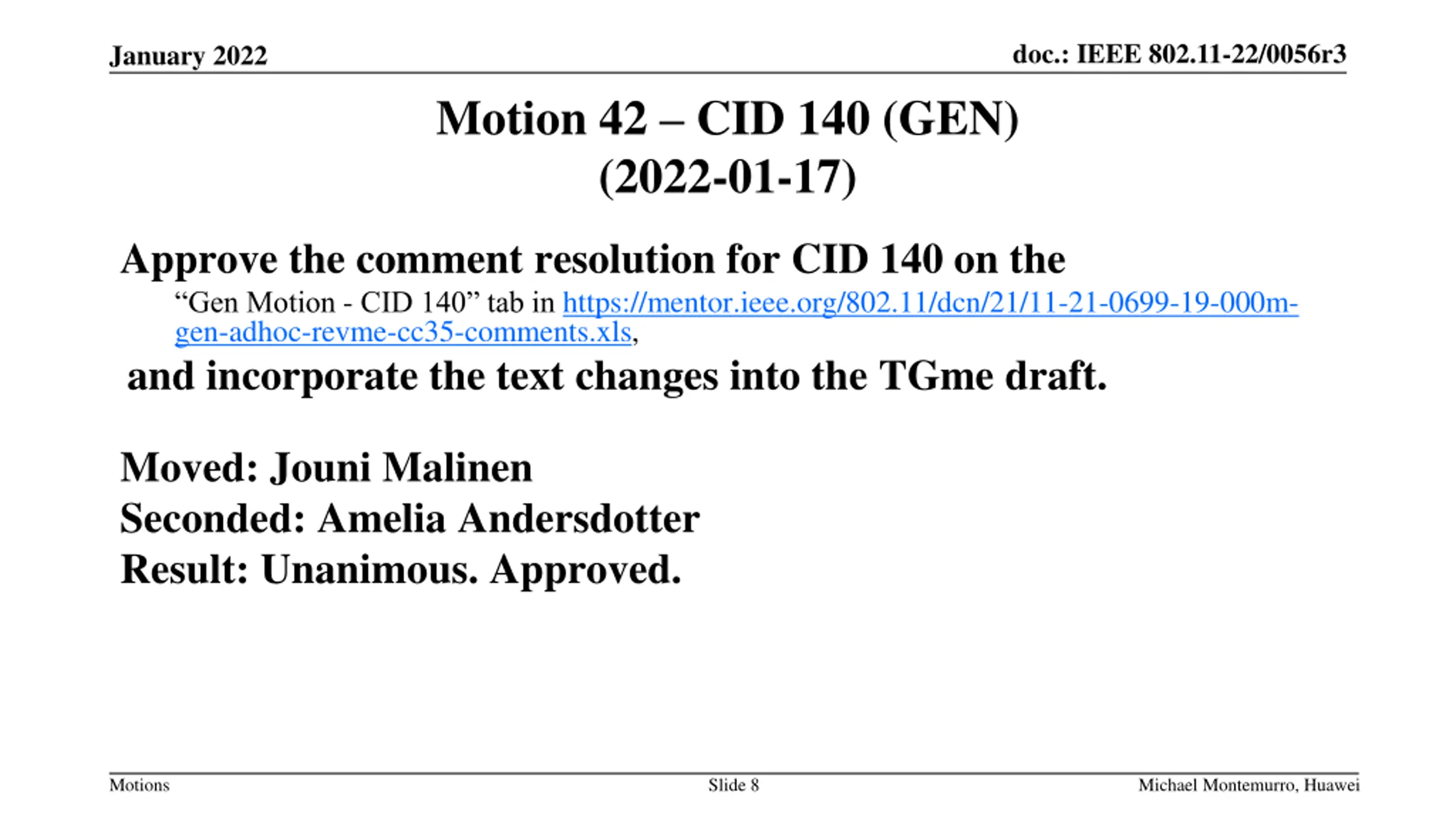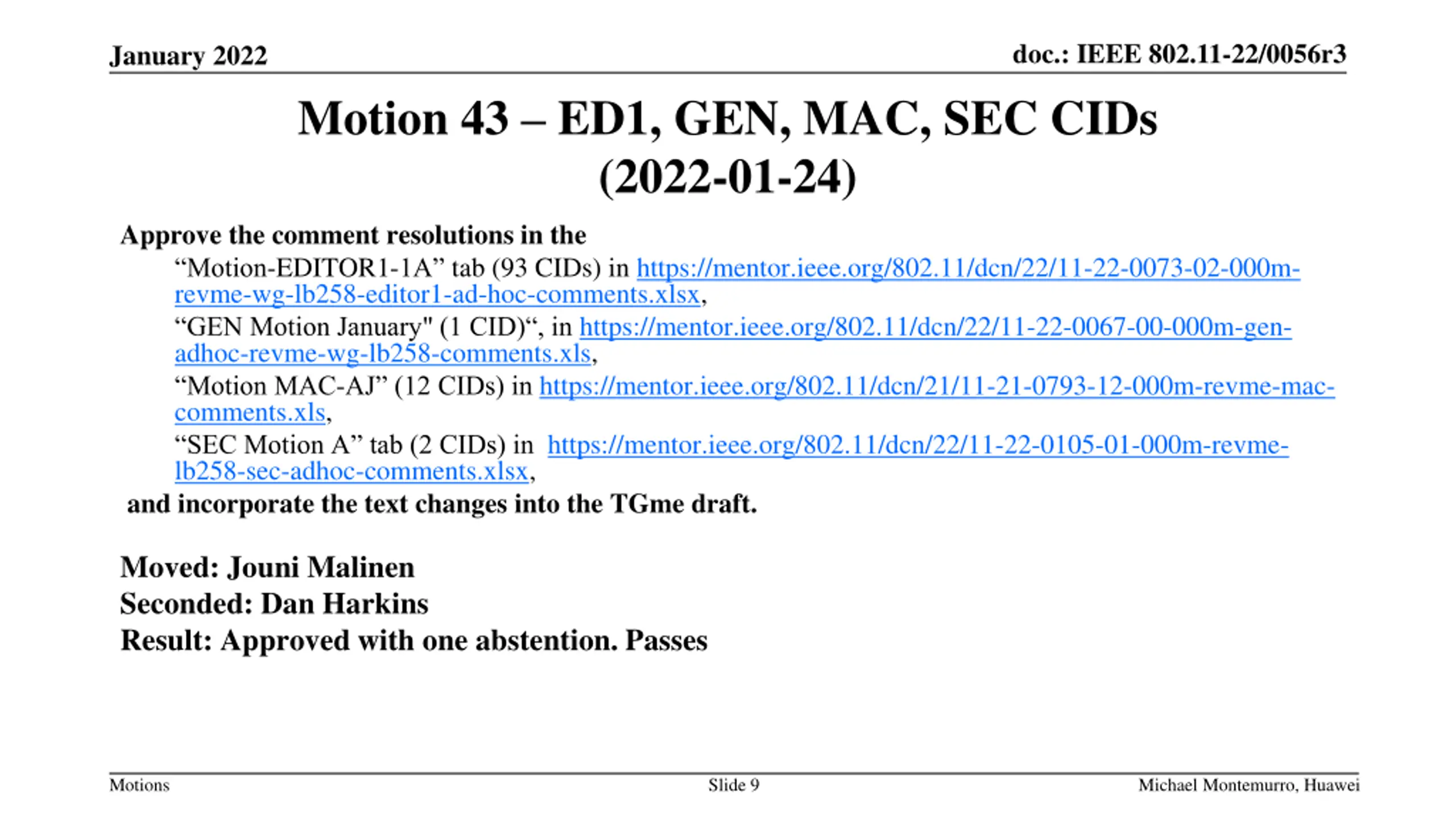 doc.: IEEE 802.11-22/0056r3 January 2022 Motion 42 CID 140 (GEN) (2022-01-17) Approve the comment resolution for CID 140 on the Gen Motion - CID 140 tab in https://mentor.ieee.org/802.11/dcn/21/11-21-0699-19-000m- gen-adhoc-revme-cc35-comments.xls, and incorporate the text changes into the TGme draft. Moved: Jouni Malinen Seconded: Amelia Andersdotter Result: Unanimous. Approved. Motions Slide 8 Michael Montemurro, Huawei