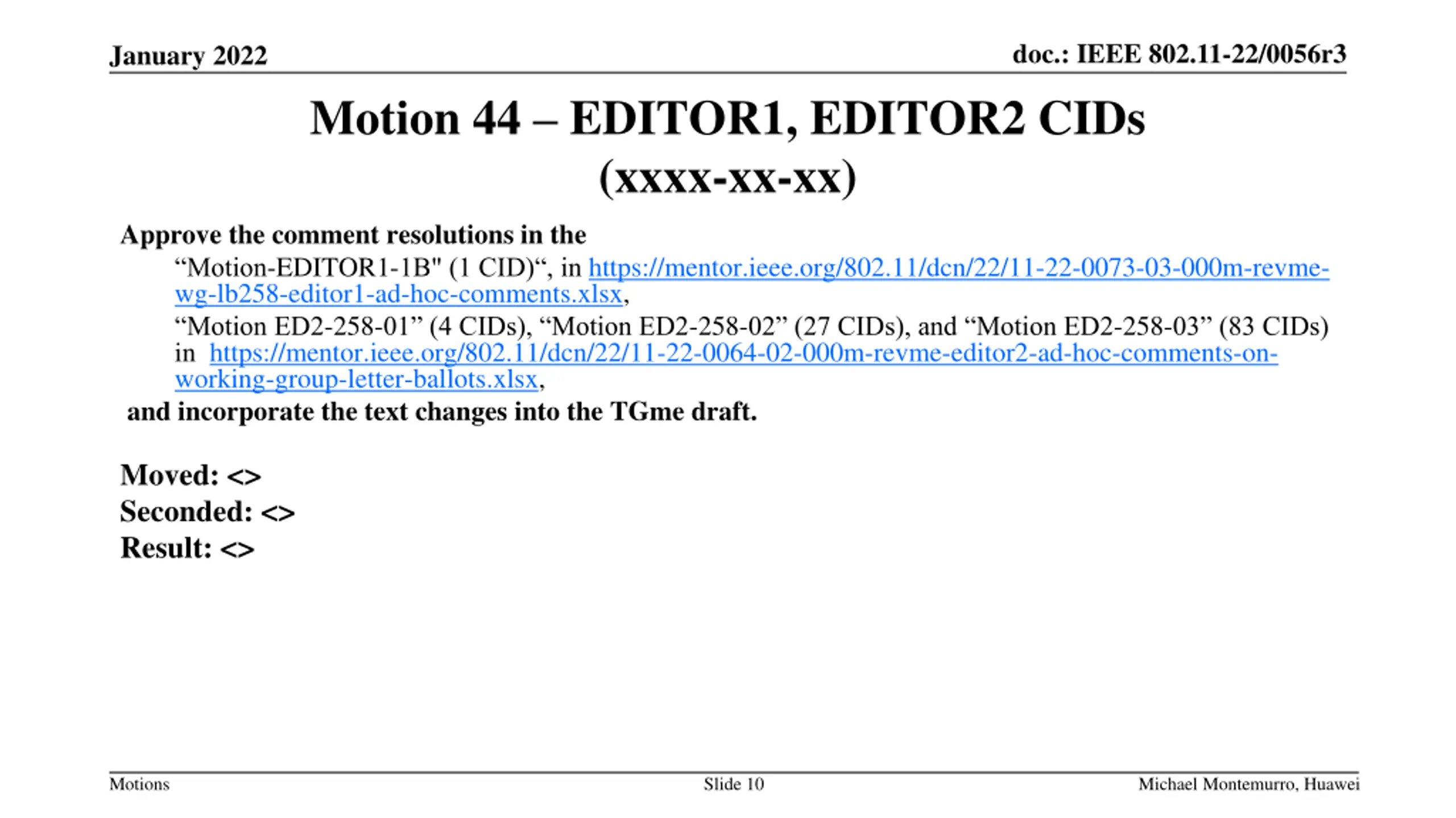 doc.: IEEE 802.11-22/0056r3 January 2022 Motion 44 EDITOR1, EDITOR2 CIDs (xxxx-xx-xx) Approve the comment resolutions in the Motion-EDITOR1-1B" (1 CID) , in https://mentor.ieee.org/802.11/dcn/22/11-22-0073-03-000m-revme- wg-lb258-editor1-ad-hoc-comments.xlsx, Motion ED2-258-01 (4 CIDs), Motion ED2-258-02 (27 CIDs), and Motion ED2-258-03 (83 CIDs) in https://mentor.ieee.org/802.11/dcn/22/11-22-0064-02-000m-revme-editor2-ad-hoc-comments-on- working-group-letter-ballots.xlsx, and incorporate the text changes into the TGme draft. Moved: <> Seconded: <> Result: <> Motions Slide 10 Michael Montemurro, Huawei