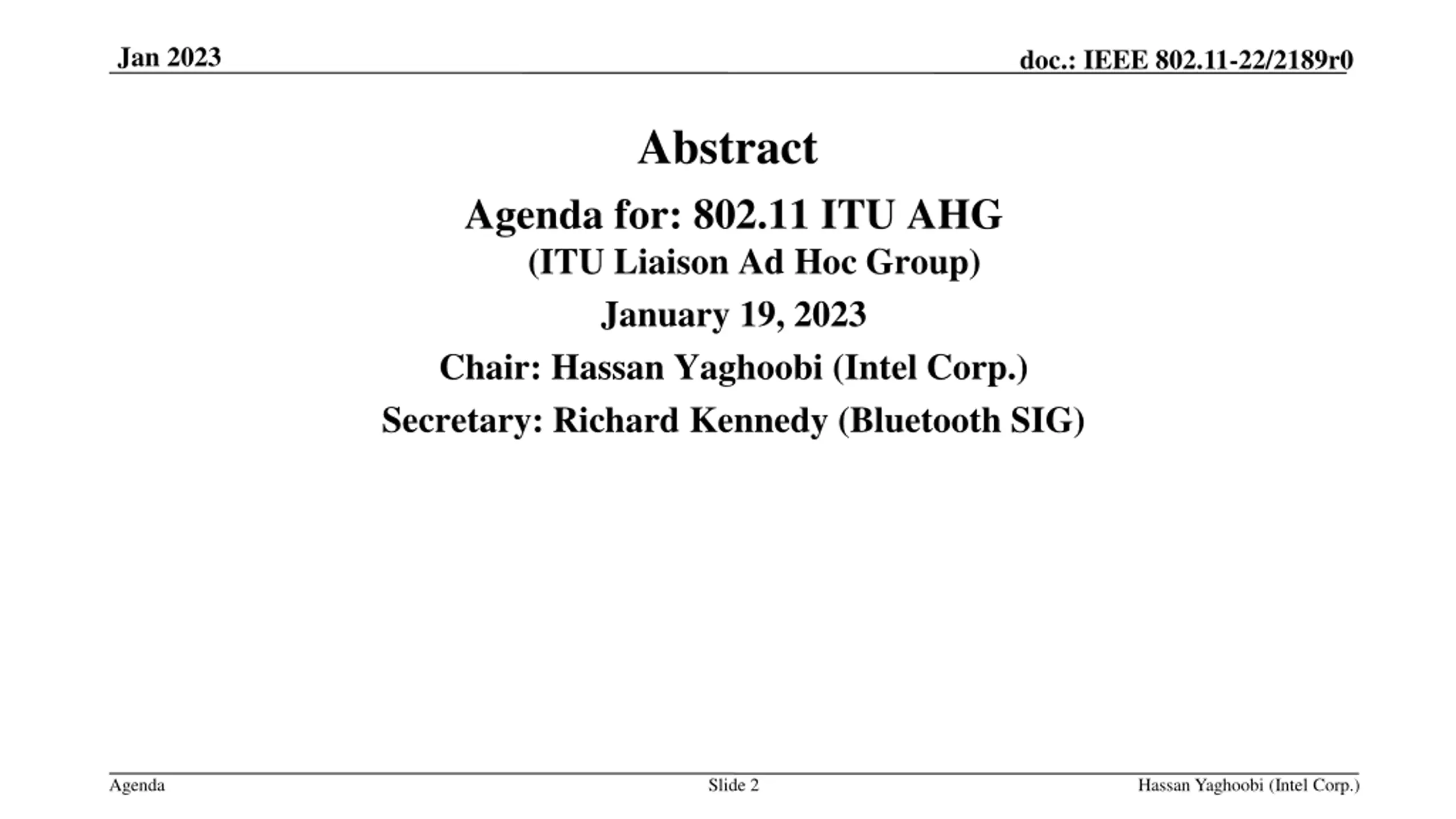 Jan 2023 doc.: IEEE 802.11-22/2189r0 Abstract Agenda for: 802.11 ITU AHG (ITU Liaison Ad Hoc Group) January 19, 2023 Chair: Hassan Yaghoobi (Intel Corp.) Secretary: Richard Kennedy (Bluetooth SIG) Agenda Slide 2 Hassan Yaghoobi (Intel Corp.)