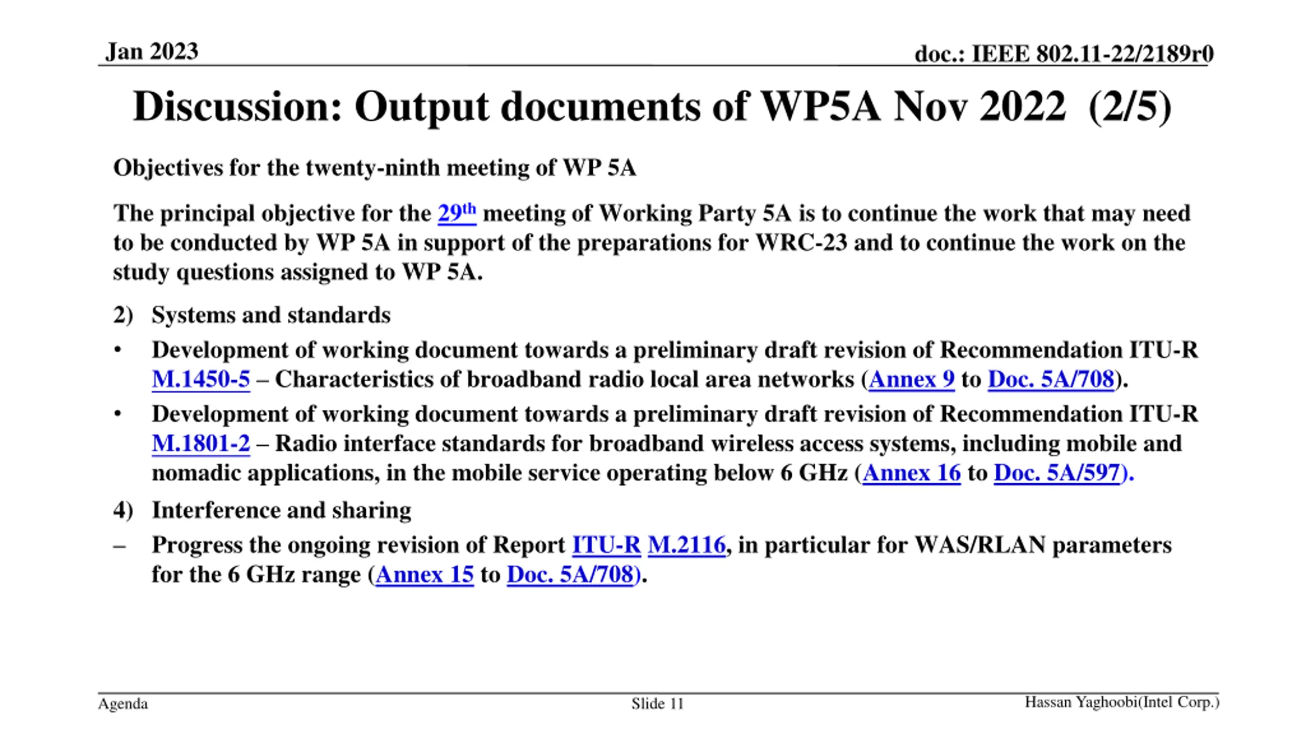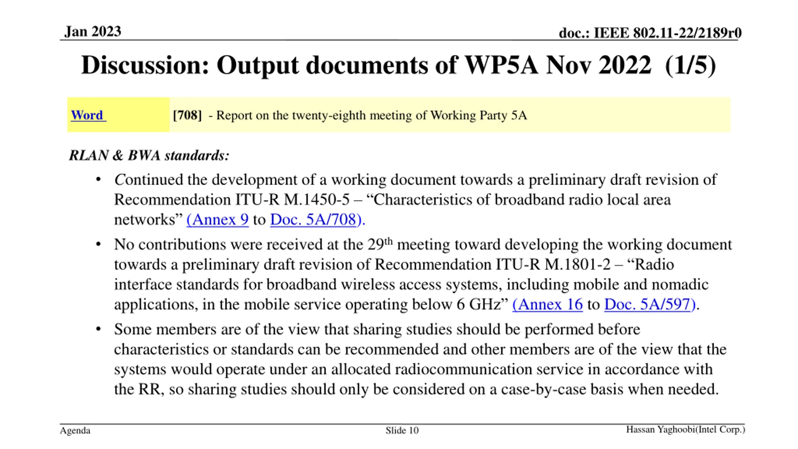 Jan 2023 doc.: IEEE 802.11-22/2189r0 Discussion: Output documents of WP5A Nov 2022 (1/5) Word [708] - Report on the twenty-eighth meeting of Working Party 5A RLAN & BWA standards: Continued the development of a working document towards a preliminary draft revision of Recommendation ITU-R M.1450-5 Characteristics of broadband radio local area networks (Annex 9 to Doc. 5A/708). No contributions were received at the 29th meeting toward developing the working document towards a preliminary draft revision of Recommendation ITU-R M.1801-2 Radio interface standards for broadband wireless access systems, including mobile and nomadic applications, in the mobile service operating below 6 GHz (Annex 16 to Doc. 5A/597). Some members are of the view that sharing studies should be performed before characteristics or standards can be recommended and other members are of the view that the systems would operate under an allocated radiocommunication service in accordance with the RR, so sharing studies should only be considered on a case-by-case basis when needed. Hassan Yaghoobi(Intel Corp.) Agenda Slide 10