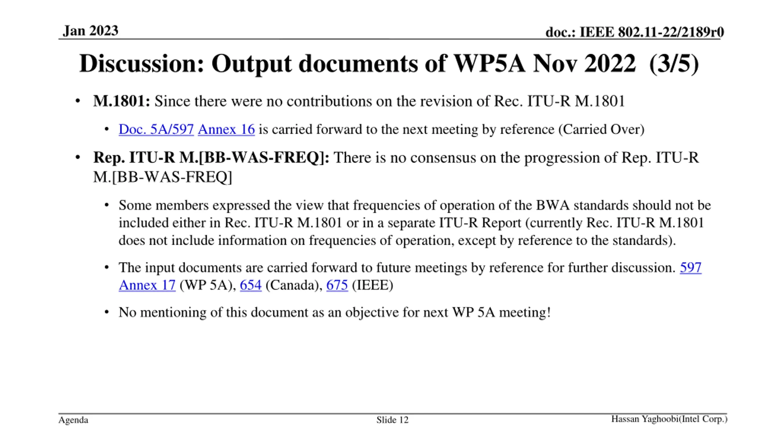 Jan 2023 doc.: IEEE 802.11-22/2189r0 Discussion: Output documents of WP5A Nov 2022 (3/5) M.1801: Since there were no contributions on the revision of Rec. ITU-R M.1801 Doc. 5A/597 Annex 16 is carried forward to the next meeting by reference (Carried Over) Rep. ITU-R M.[BB-WAS-FREQ]: There is no consensus on the progression of Rep. ITU-R M.[BB-WAS-FREQ] Some members expressed the view that frequencies of operation of the BWA standards should not be included either in Rec. ITU-R M.1801 or in a separate ITU-R Report (currently Rec. ITU-R M.1801 does not include information on frequencies of operation, except by reference to the standards). The input documents are carried forward to future meetings by reference for further discussion. 597 Annex 17 (WP 5A), 654 (Canada), 675 (IEEE) No mentioning of this document as an objective for next WP 5A meeting! Hassan Yaghoobi(Intel Corp.) Agenda Slide 12