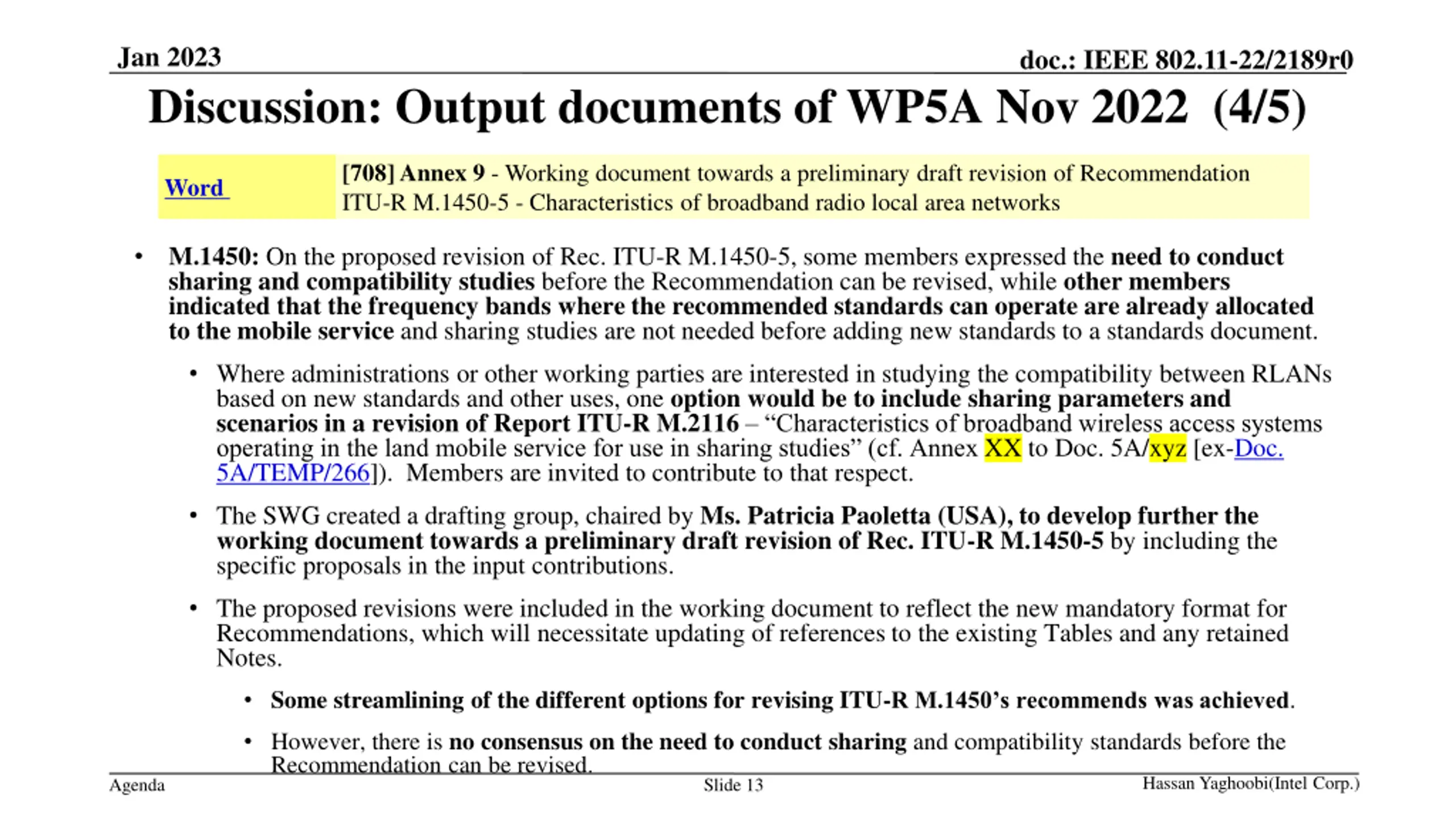 Jan 2023 doc.: IEEE 802.11-22/2189r0 Discussion: Output documents of WP5A Nov 2022 (4/5) [708] Annex 9 - Working document towards a preliminary draft revision of Recommendation ITU-R M.1450-5 - Characteristics of broadband radio local area networks Word M.1450: On the proposed revision of Rec. ITU-R M.1450-5, some members expressed the need to conduct sharing and compatibility studies before the Recommendation can be revised, while other members indicated that the frequency bands where the recommended standards can operate are already allocated to the mobile service and sharing studies are not needed before adding new standards to a standards document. Where administrations or other working parties are interested in studying the compatibility between RLANs based on new standards and other uses, one option would be to include sharing parameters and scenarios in a revision of Report ITU-R M.2116 Characteristics of broadband wireless access systems operating in the land mobile service for use in sharing studies (cf. Annex XX to Doc. 5A/xyz [ex-Doc. 5A/TEMP/266]). Members are invited to contribute to that respect. The SWG created a drafting group, chaired by Ms. Patricia Paoletta (USA), to develop further the working document towards a preliminary draft revision of Rec. ITU-R M.1450-5 by including the specific proposals in the input contributions. The proposed revisions were included in the working document to reflect the new mandatory format for Recommendations, which will necessitate updating of references to the existing Tables and any retained Notes. Some streamlining of the different options for revising ITU-R M.1450 s recommends was achieved. However, there is no consensus on the need to conduct sharing and compatibility standards before the Recommendation can be revised. Slide 13 Hassan Yaghoobi(Intel Corp.) Agenda
