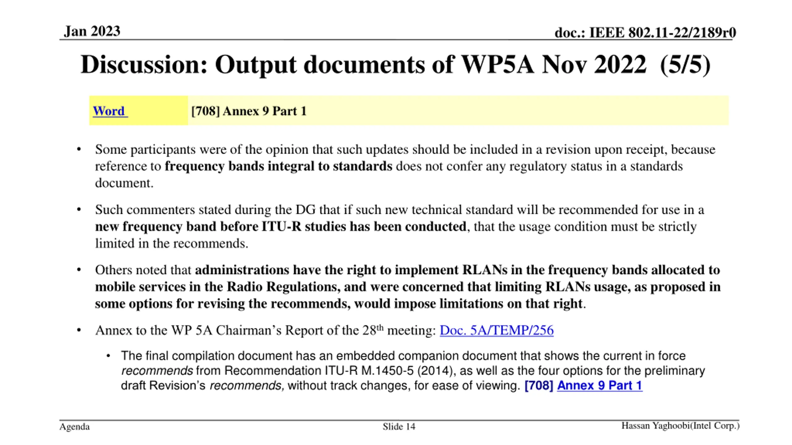 Jan 2023 doc.: IEEE 802.11-22/2189r0 Discussion: Output documents of WP5A Nov 2022 (5/5) Word [708] Annex 9 Part 1 Some participants were of the opinion that such updates should be included in a revision upon receipt, because reference to frequency bands integral to standards does not confer any regulatory status in a standards document. Such commenters stated during the DG that if such new technical standard will be recommended for use in a new frequency band before ITU-R studies has been conducted, that the usage condition must be strictly limited in the recommends. Others noted that administrations have the right to implement RLANs in the frequency bands allocated to mobile services in the Radio Regulations, and were concerned that limiting RLANs usage, as proposed in some options for revising the recommends, would impose limitations on that right. Annex to the WP 5A Chairman s Report of the 28th meeting: Doc. 5A/TEMP/256 The final compilation document has an embedded companion document that shows the current in force recommends from Recommendation ITU-R M.1450-5 (2014), as well as the four options for the preliminary draft Revision s recommends, without track changes, for ease of viewing. [708] Annex 9 Part 1 Hassan Yaghoobi(Intel Corp.) Agenda Slide 14