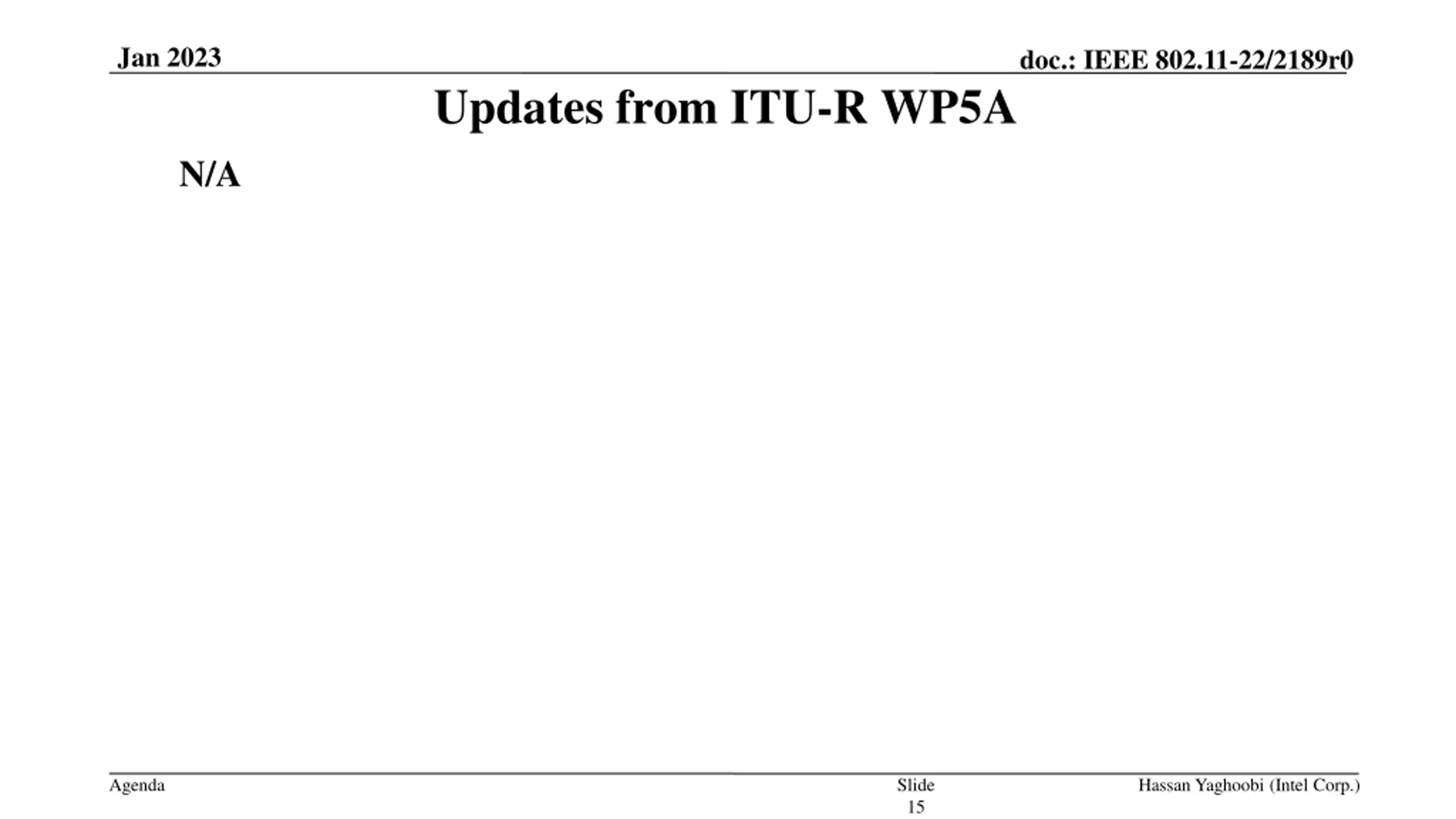 Jan 2023 doc.: IEEE 802.11-22/2189r0 Updates from ITU-R WP5A N/A Agenda Slide 15 Hassan Yaghoobi (Intel Corp.)