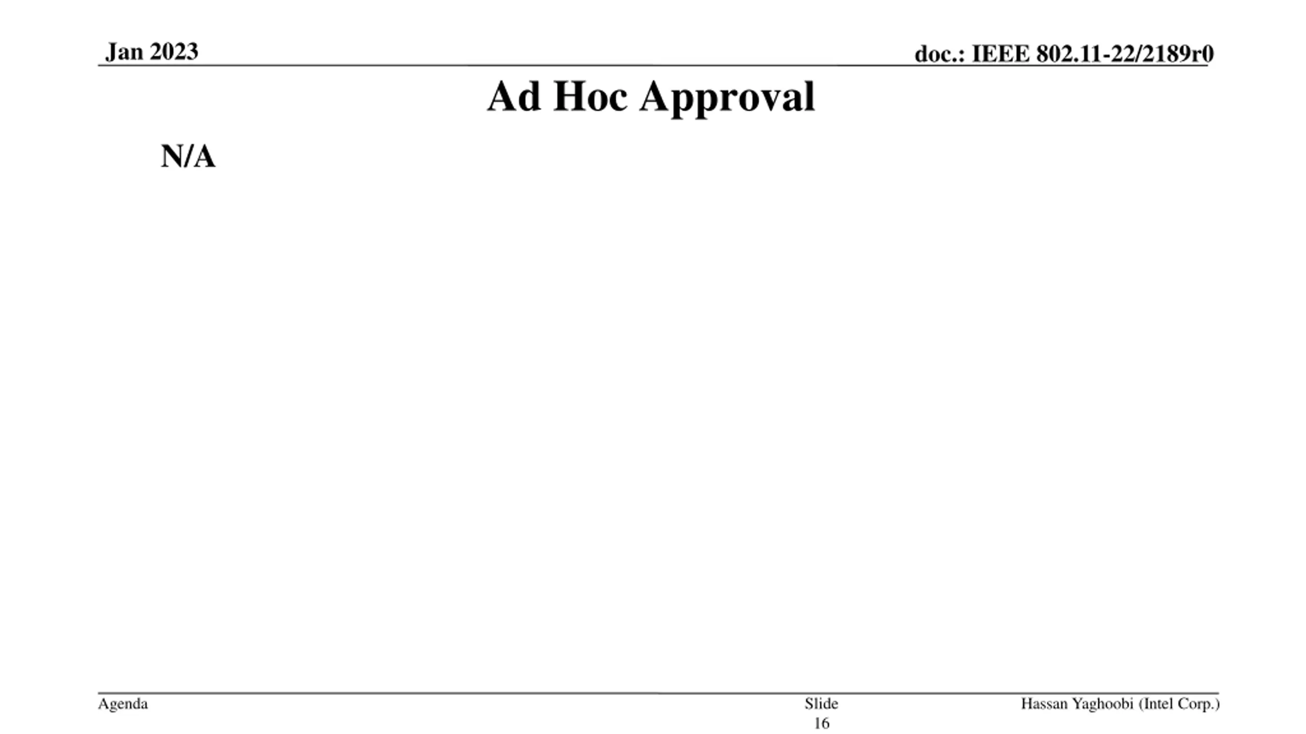 Jan 2023 doc.: IEEE 802.11-22/2189r0 Ad Hoc Approval N/A Agenda Slide 16 Hassan Yaghoobi (Intel Corp.)