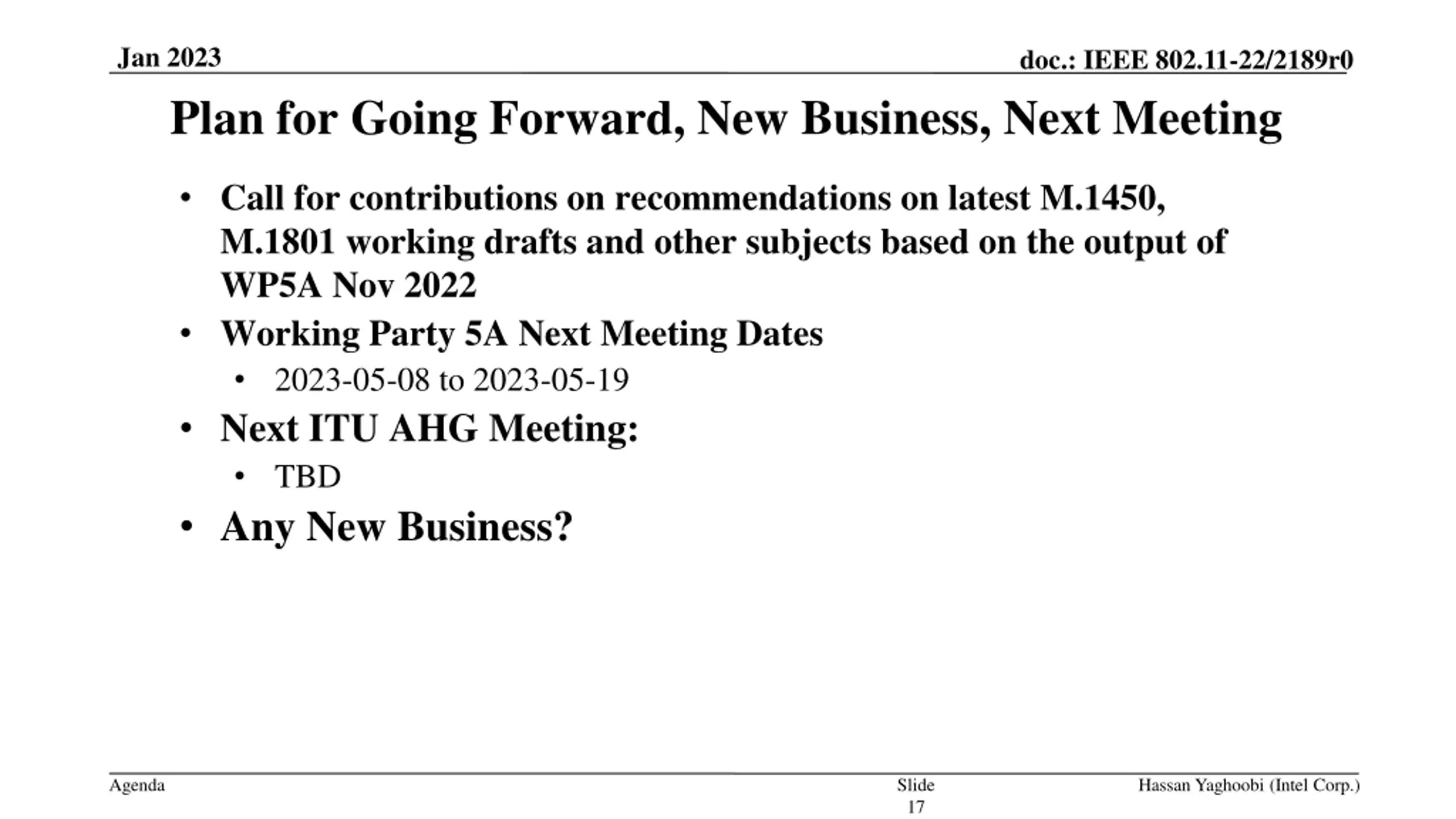 Jan 2023 doc.: IEEE 802.11-22/2189r0 Plan for Going Forward, New Business, Next Meeting Call for contributions on recommendations on latest M.1450, M.1801 working drafts and other subjects based on the output of WP5A Nov 2022 Working Party 5A Next Meeting Dates 2023-05-08 to 2023-05-19 Next ITU AHG Meeting: TBD Any New Business? Agenda Slide 17 Hassan Yaghoobi (Intel Corp.)