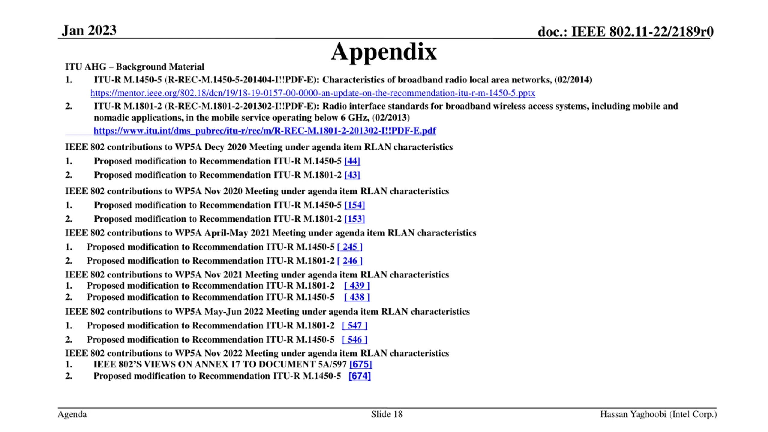 Jan 2023 doc.: IEEE 802.11-22/2189r0 Appendix ITU AHG Background Material 1. ITU-R M.1450-5 (R-REC-M.1450-5-201404-I!!PDF-E): Characteristics of broadband radio local area networks, (02/2014) https://mentor.ieee.org/802.18/dcn/19/18-19-0157-00-0000-an-update-on-the-recommendation-itu-r-m-1450-5.pptx 2. ITU-R M.1801-2 (R-REC-M.1801-2-201302-I!!PDF-E): Radio interface standards for broadband wireless access systems, including mobile and nomadic applications, in the mobile service operating below 6 GHz, (02/2013) https://www.itu.int/dms_pubrec/itu-r/rec/m/R-REC-M.1801-2-201302-I!!PDF-E.pdf IEEE 802 contributions to WP5A Decy 2020 Meeting under agenda item RLAN characteristics 1. Proposed modification to Recommendation ITU-R M.1450-5 [44] 2. Proposed modification to Recommendation ITU-R M.1801-2 [43] IEEE 802 contributions to WP5A Nov 2020 Meeting under agenda item RLAN characteristics 1. Proposed modification to Recommendation ITU-R M.1450-5 [154] 2. Proposed modification to Recommendation ITU-R M.1801-2 [153] IEEE 802 contributions to WP5A April-May 2021 Meeting under agenda item RLAN characteristics 1. Proposed modification to Recommendation ITU-R M.1450-5 [ 245 ] 2. Proposed modification to Recommendation ITU-R M.1801-2 [ 246 ] IEEE 802 contributions to WP5A Nov 2021 Meeting under agenda item RLAN characteristics 1. Proposed modification to Recommendation ITU-R M.1801-2 [ 439 ] 2. Proposed modification to Recommendation ITU-R M.1450-5 [ 438 ] IEEE 802 contributions to WP5A May-Jun 2022 Meeting under agenda item RLAN characteristics 1. Proposed modification to Recommendation ITU-R M.1801-2 [ 547 ] 2. Proposed modification to Recommendation ITU-R M.1450-5 [ 546 ] IEEE 802 contributions to WP5A Nov 2022 Meeting under agenda item RLAN characteristics 1. IEEE 802 S VIEWS ON ANNEX 17 TO DOCUMENT 5A/597[675] 2. Proposed modification to Recommendation ITU-R M.1450-5 [674] Agenda Slide 18 Hassan Yaghoobi (Intel Corp.)