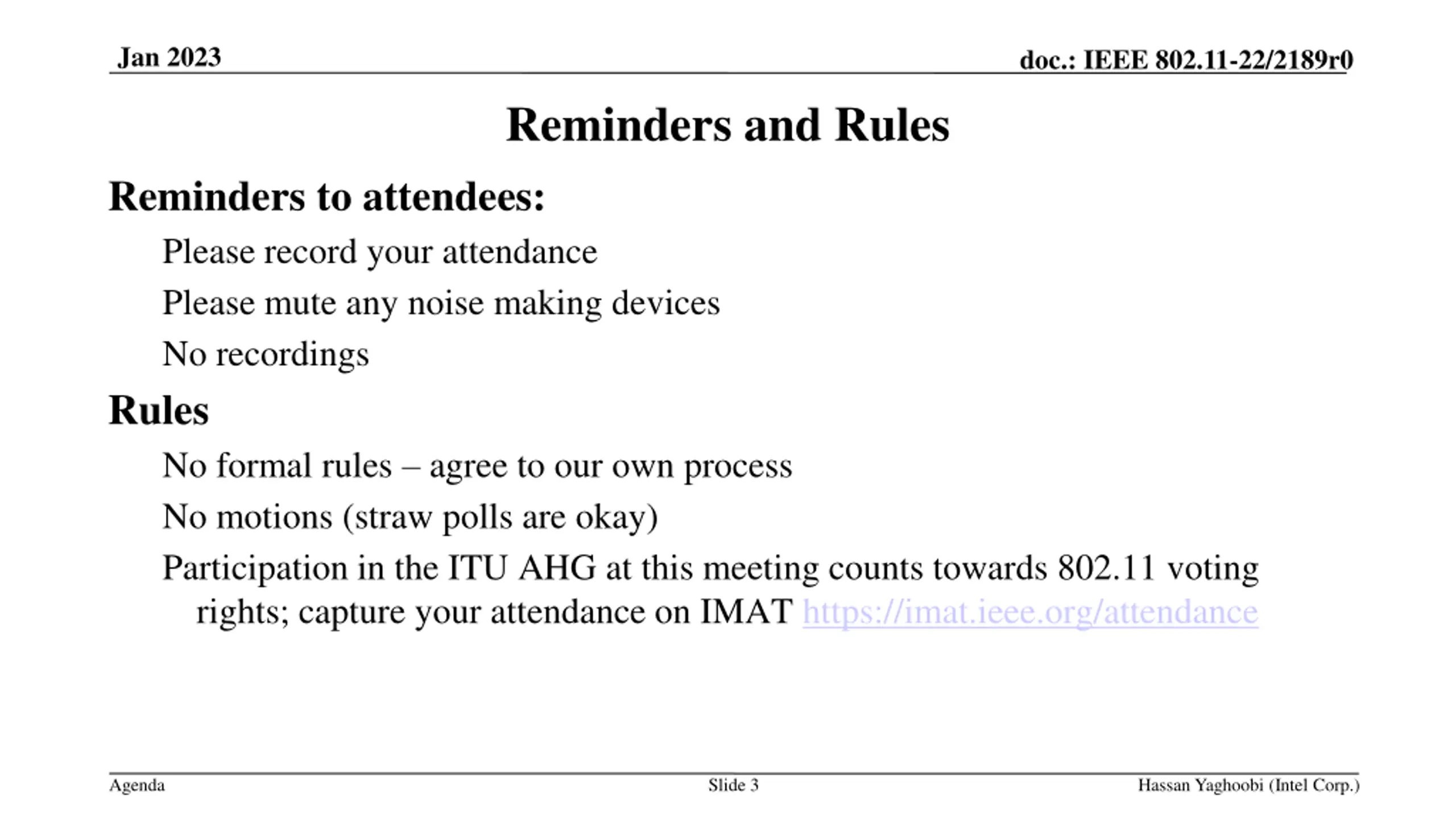 Jan 2023 doc.: IEEE 802.11-22/2189r0 Reminders and Rules Reminders to attendees: Please record your attendance Please mute any noise making devices No recordings Rules No formal rules agree to our own process No motions (straw polls are okay) Participation in the ITU AHG at this meeting counts towards 802.11 voting rights; capture your attendance on IMAT https://imat.ieee.org/attendance Agenda Slide 3 Hassan Yaghoobi (Intel Corp.)
