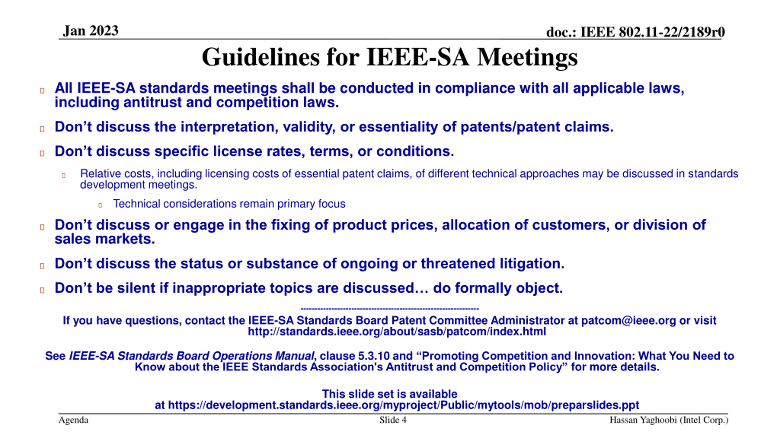 Jan 2023 doc.: IEEE 802.11-22/2189r0 Guidelines for IEEE-SA Meetings All IEEE-SA standards meetings shall be conducted in compliance with all applicable laws, including antitrust and competition laws. Don t discuss the interpretation, validity, or essentiality of patents/patent claims. Don t discuss specific license rates, terms, or conditions. Relative costs, including licensing costs of essential patent claims, of different technical approaches may be discussed in standards development meetings. Technical considerations remain primary focus Don t discuss or engage in the fixing of product prices, allocation of customers, or division of sales markets. Don t discuss the status or substance of ongoing or threatened litigation. Don t be silent if inappropriate topics are discussed do formally object. --------------------------------------------------------------- If you have questions, contact the IEEE-SA Standards Board Patent Committee Administrator at patcom@ieee.org or visit http://standards.ieee.org/about/sasb/patcom/index.html See IEEE-SA Standards Board Operations Manual, clause 5.3.10 and Promoting Competition and Innovation: What You Need to Know about the IEEE Standards Association's Antitrust and Competition Policy for more details. This slide set is available at https://development.standards.ieee.org/myproject/Public/mytools/mob/preparslides.ppt Agenda Slide 4 Hassan Yaghoobi (Intel Corp.)