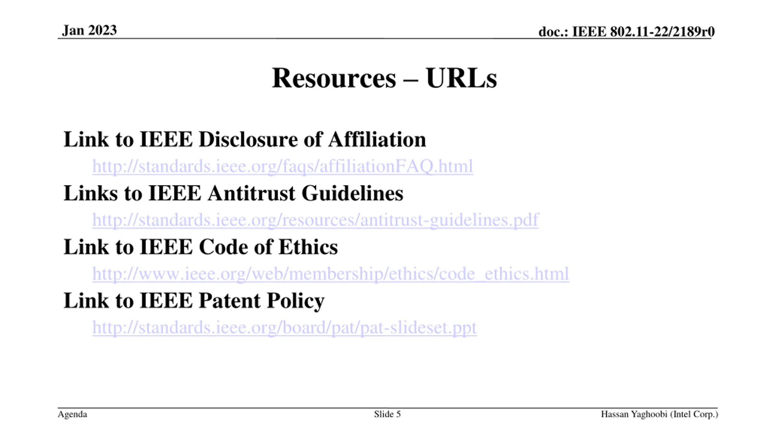 Jan 2023 doc.: IEEE 802.11-22/2189r0 Resources URLs Link to IEEE Disclosure of Affiliation http://standards.ieee.org/faqs/affiliationFAQ.html Links to IEEE Antitrust Guidelines http://standards.ieee.org/resources/antitrust-guidelines.pdf Link to IEEE Code of Ethics http://www.ieee.org/web/membership/ethics/code_ethics.html Link to IEEE Patent Policy http://standards.ieee.org/board/pat/pat-slideset.ppt Agenda Slide 5 Hassan Yaghoobi (Intel Corp.)
