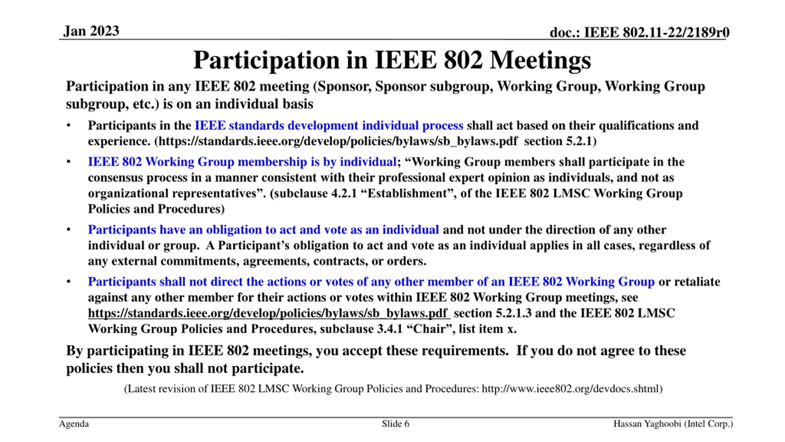 Jan 2023 doc.: IEEE 802.11-22/2189r0 Participation in IEEE 802 Meetings Participation in any IEEE 802 meeting (Sponsor, Sponsor subgroup, Working Group, Working Group subgroup, etc.) is on an individual basis Participants in the IEEE standards development individual process shall act based on their qualifications and experience. (https://standards.ieee.org/develop/policies/bylaws/sb_bylaws.pdf section 5.2.1) IEEE 802 Working Group membership is by individual; Working Group members shall participate in the consensus process in a manner consistent with their professional expert opinion as individuals, and not as organizational representatives . (subclause 4.2.1 Establishment , of the IEEE 802 LMSC Working Group Policies and Procedures) Participants have an obligation to act and vote as an individual and not under the direction of any other individual or group. A Participant s obligation to act and vote as an individual applies in all cases, regardless of any external commitments, agreements, contracts, or orders. Participants shall not direct the actions or votes of any other member of an IEEE 802 Working Group or retaliate against any other member for their actions or votes within IEEE 802 Working Group meetings, see https://standards.ieee.org/develop/policies/bylaws/sb_bylaws.pdf section 5.2.1.3 and the IEEE 802 LMSC Working Group Policies and Procedures, subclause 3.4.1 Chair , list item x. By participating in IEEE 802 meetings, you accept these requirements. If you do not agree to these policies then you shall not participate. (Latest revision of IEEE 802 LMSC Working Group Policies and Procedures: http://www.ieee802.org/devdocs.shtml) Agenda Slide 6 Hassan Yaghoobi (Intel Corp.)