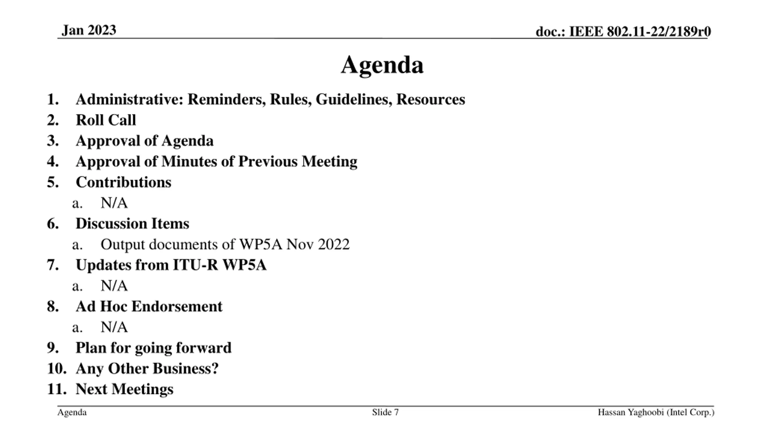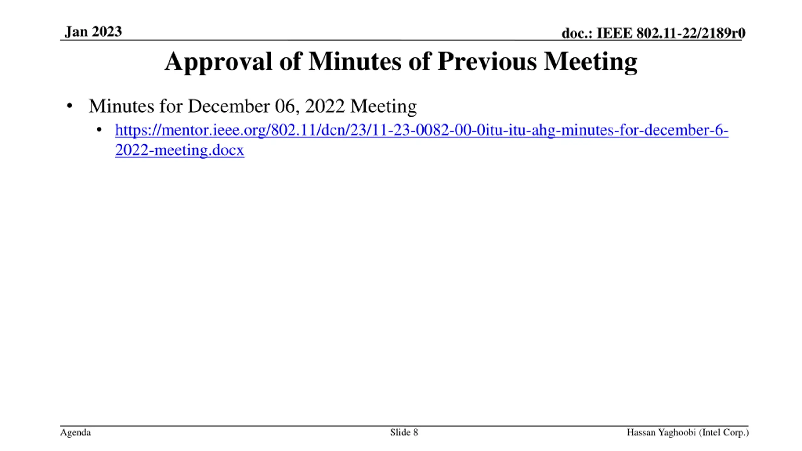 Jan 2023 doc.: IEEE 802.11-22/2189r0 Approval of Minutes of Previous Meeting Minutes for December 06, 2022 Meeting https://mentor.ieee.org/802.11/dcn/23/11-23-0082-00-0itu-itu-ahg-minutes-for-december-6- 2022-meeting.docx Agenda Slide 8 Hassan Yaghoobi (Intel Corp.)