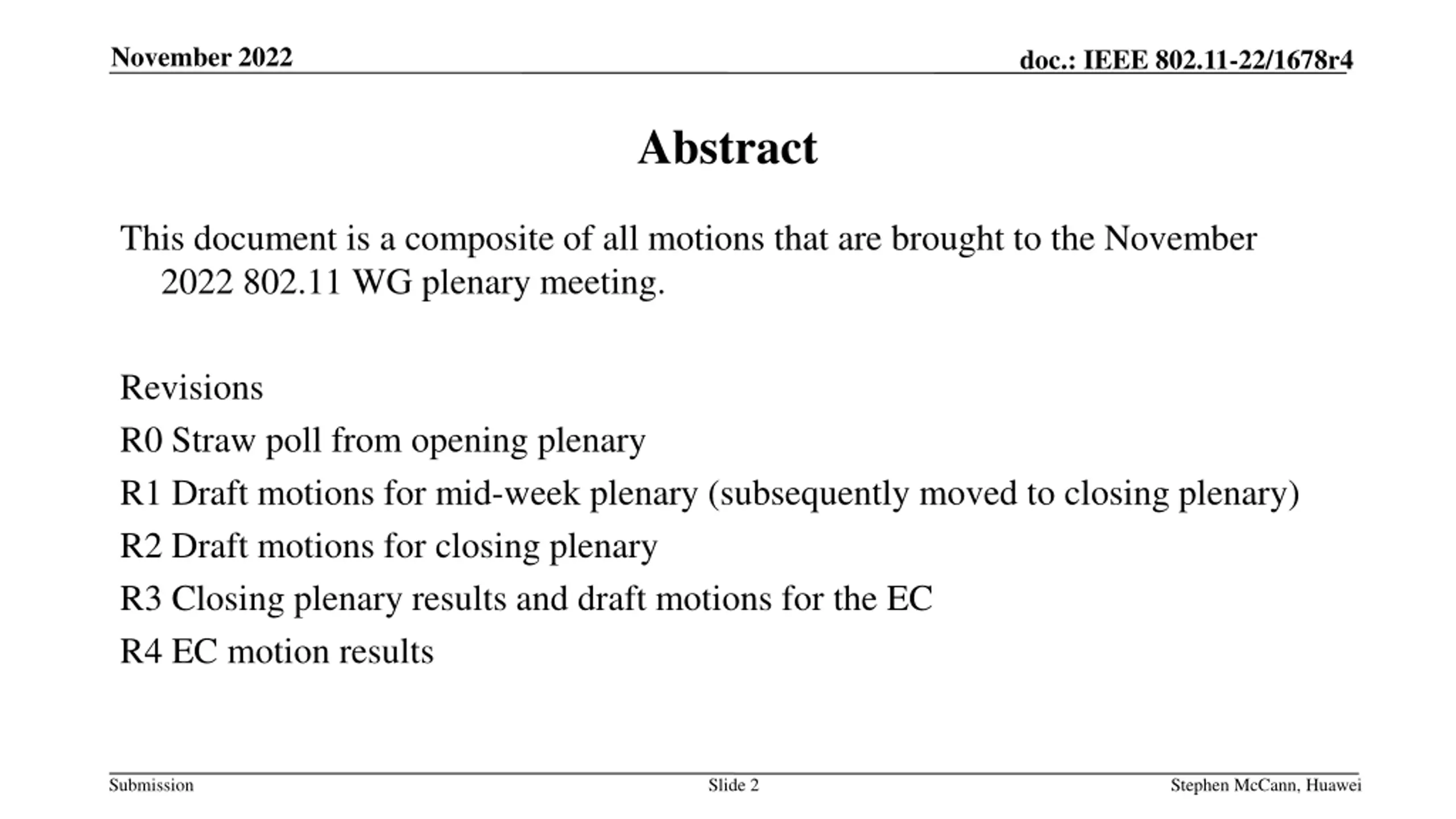 November 2022 doc.: IEEE 802.11-22/1678r4 Abstract This document is a composite of all motions that are brought to the November 2022 802.11 WG plenary meeting. Revisions R0 Straw poll from opening plenary R1 Draft motions for mid-week plenary (subsequently moved to closing plenary) R2 Draft motions for closing plenary R3 Closing plenary results and draft motions for the EC R4 EC motion results Submission Slide 2 Stephen McCann, Huawei
