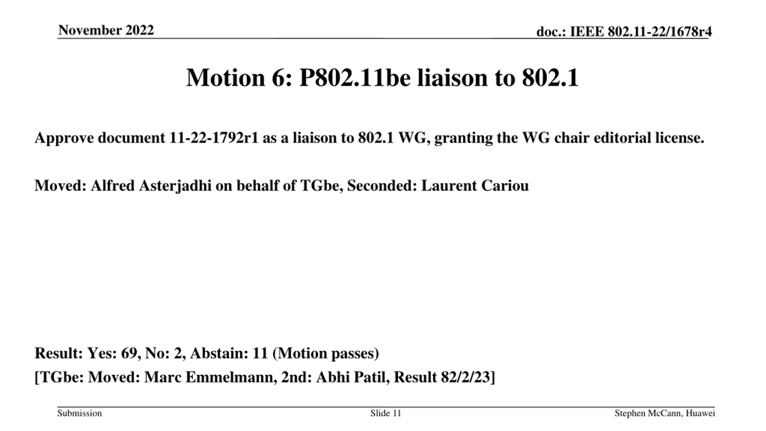 November 2022 doc.: IEEE 802.11-22/1678r4 Motion 6: P802.11be liaison to 802.1 Approve document 11-22-1792r1 as a liaison to 802.1 WG, granting the WG chair editorial license. Moved: Alfred Asterjadhi on behalf of TGbe, Seconded: Laurent Cariou Result: Yes: 69, No: 2, Abstain: 11 (Motion passes) [TGbe: Moved: Marc Emmelmann, 2nd: Abhi Patil, Result 82/2/23] Submission Slide 11 Stephen McCann, Huawei