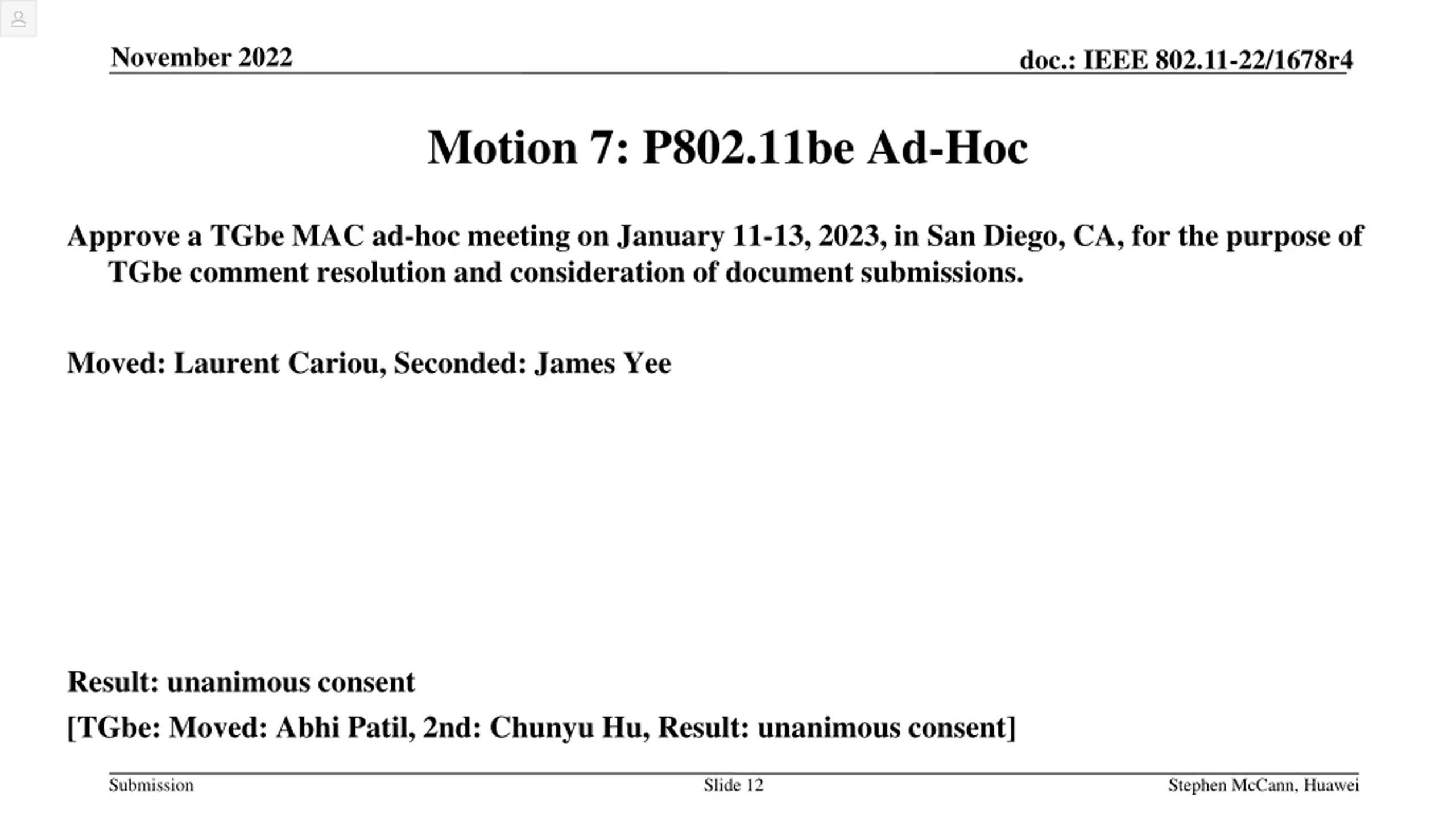 November 2022 doc.: IEEE 802.11-22/1678r4 Motion 7: P802.11be Ad-Hoc Approve a TGbe MAC ad-hoc meeting on January 11-13, 2023, in San Diego, CA, for the purpose of TGbe comment resolution and consideration of document submissions. Moved: Laurent Cariou, Seconded: James Yee Result: unanimous consent [TGbe: Moved: Abhi Patil, 2nd: Chunyu Hu, Result: unanimous consent] Submission Slide 12 Stephen McCann, Huawei