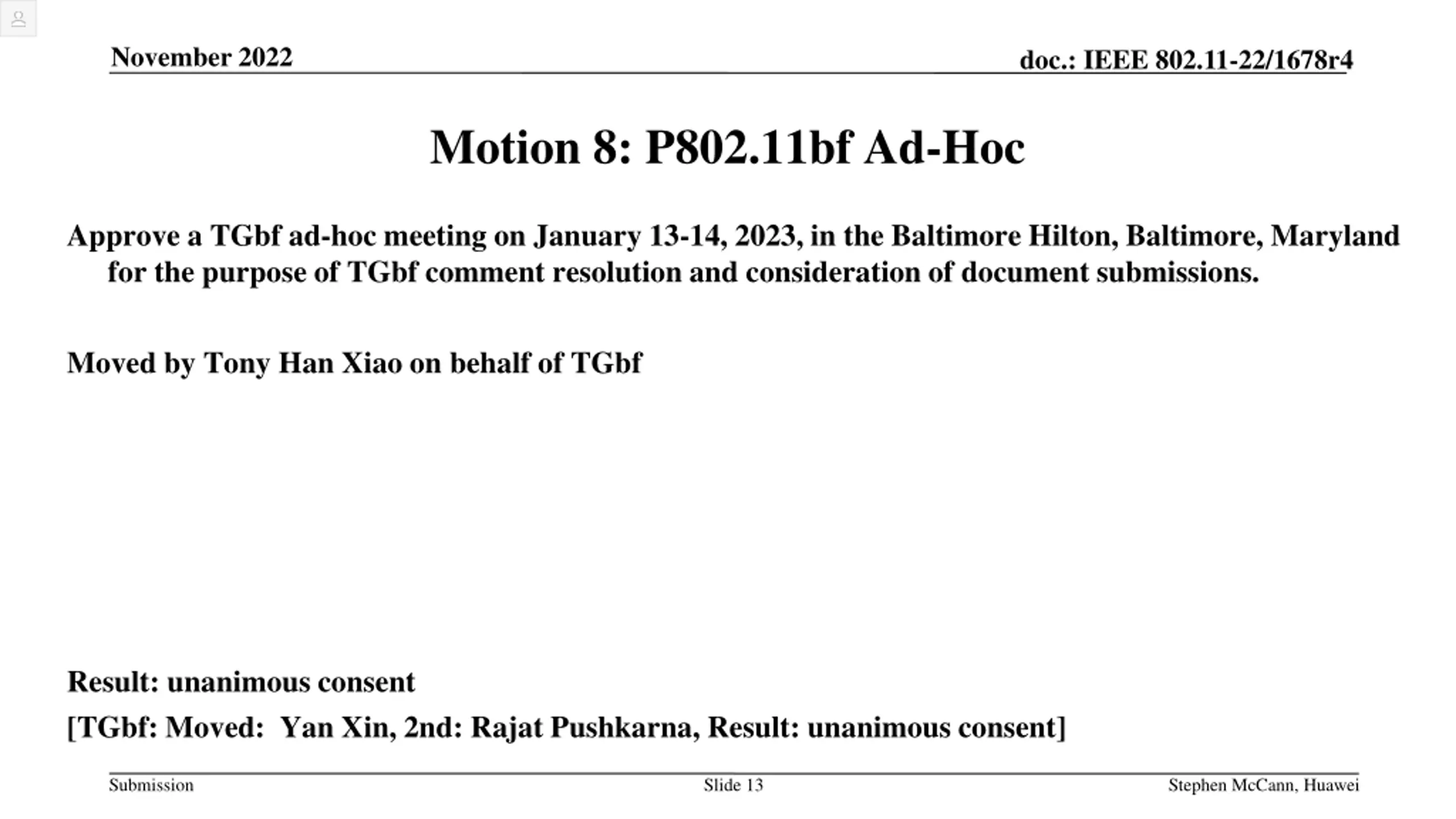 November 2022 doc.: IEEE 802.11-22/1678r4 Motion 8: P802.11bf Ad-Hoc Approve a TGbf ad-hoc meeting on January 13-14, 2023, in the Baltimore Hilton, Baltimore, Maryland for the purpose of TGbf comment resolution and consideration of document submissions. Moved by Tony Han Xiao on behalf of TGbf Result: unanimous consent [TGbf: Moved: Yan Xin, 2nd: Rajat Pushkarna, Result: unanimous consent] Submission Slide 13 Stephen McCann, Huawei