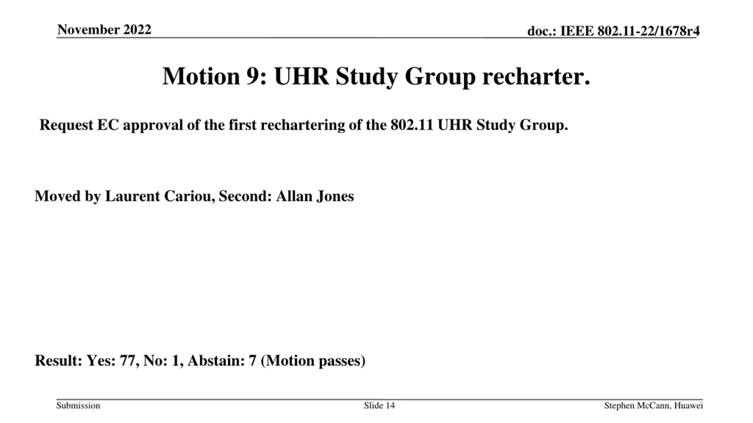 November 2022 doc.: IEEE 802.11-22/1678r4 Motion 9: UHR Study Group recharter. Request EC approval of the first rechartering of the 802.11 UHR Study Group. Moved by Laurent Cariou, Second: Allan Jones Result: Yes: 77, No: 1, Abstain: 7 (Motion passes) Submission Slide 14 Stephen McCann, Huawei