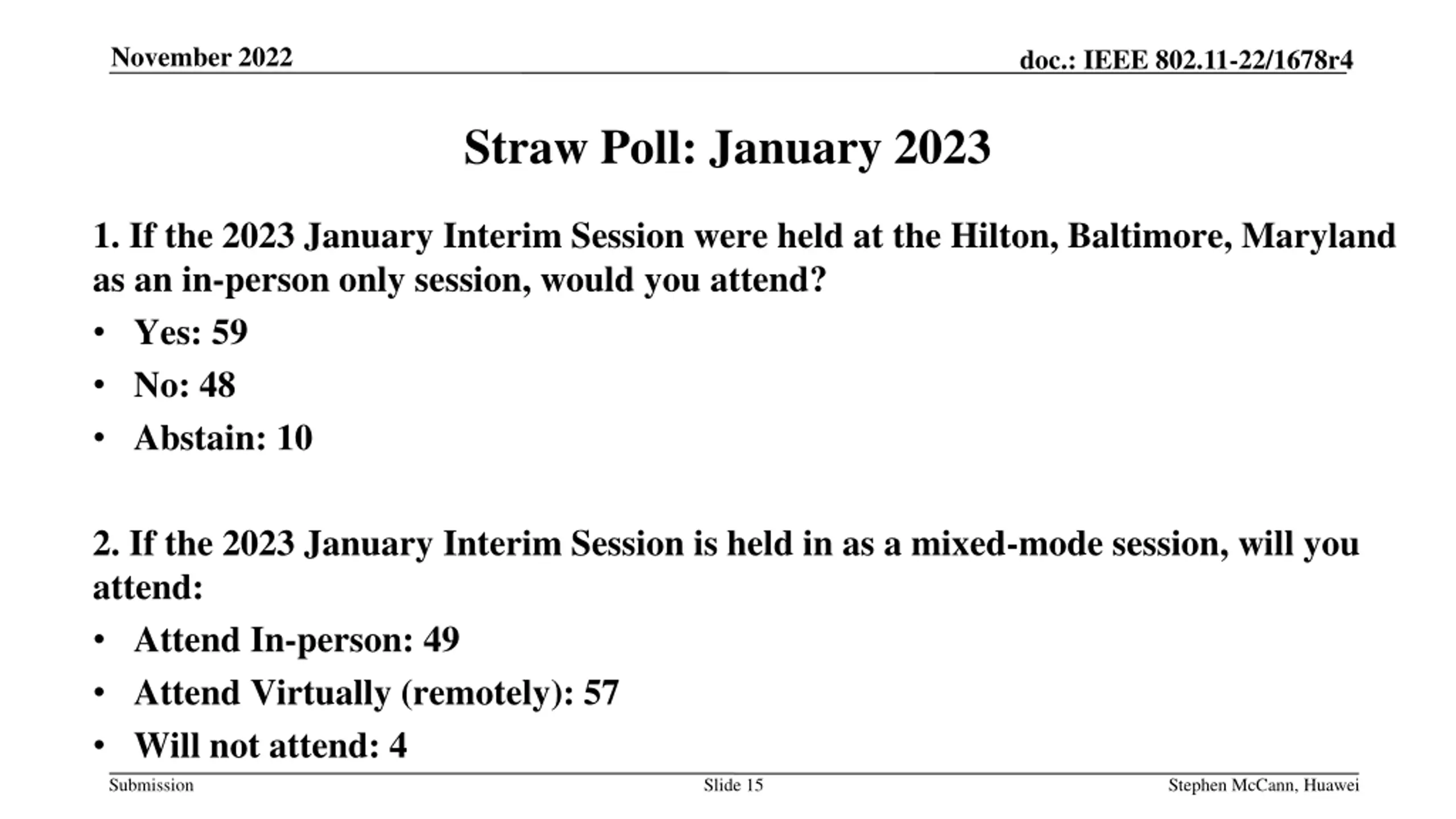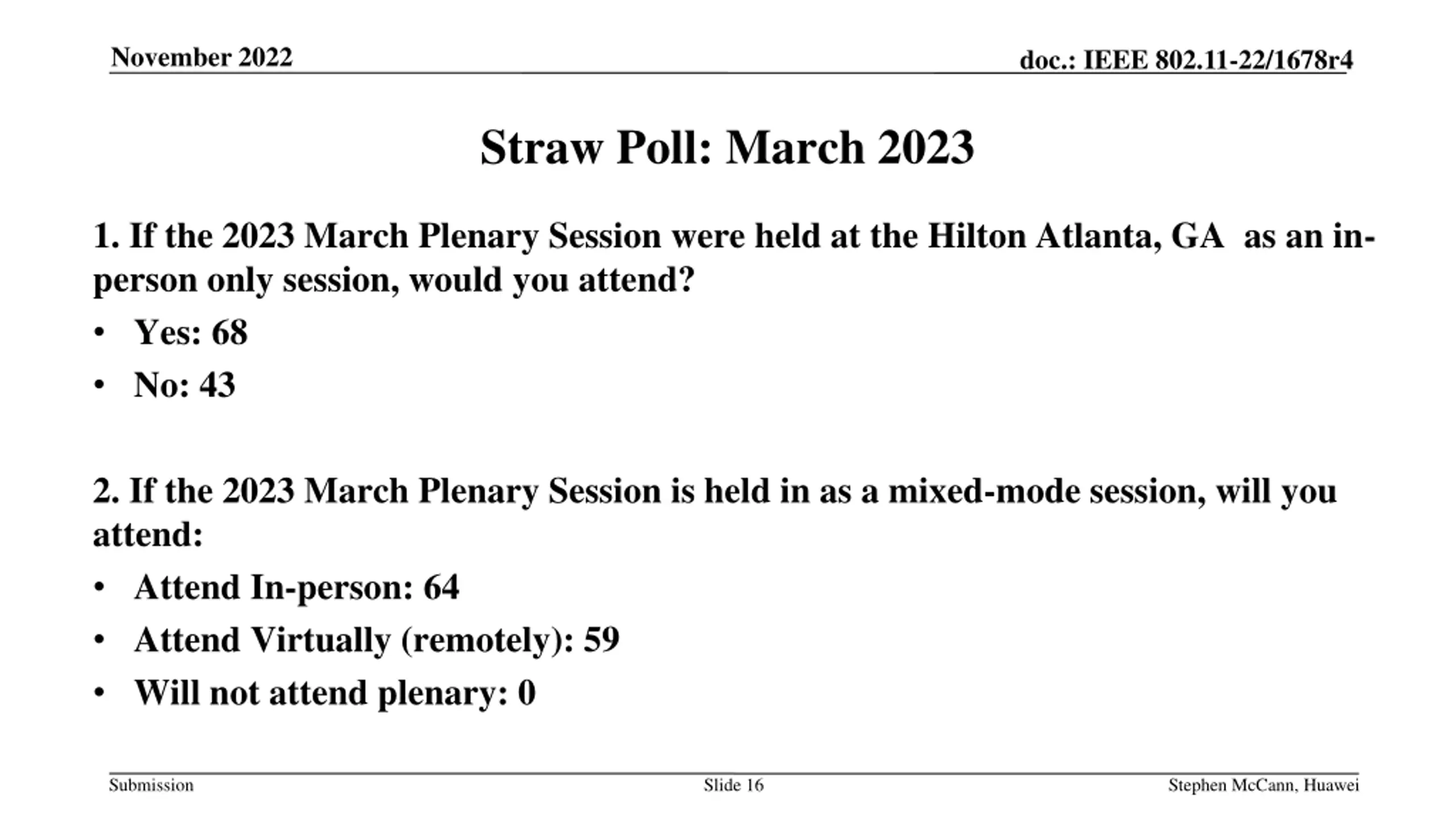 November 2022 doc.: IEEE 802.11-22/1678r4 Straw Poll: January 2023 1. If the 2023 January Interim Session were held at the Hilton, Baltimore, Maryland as an in-person only session, would you attend? Yes: 59 No: 48 Abstain: 10 2. If the 2023 January Interim Session is held in as a mixed-mode session, will you attend: Attend In-person: 49 Attend Virtually (remotely): 57 Will not attend: 4 Submission Slide 15 Stephen McCann, Huawei